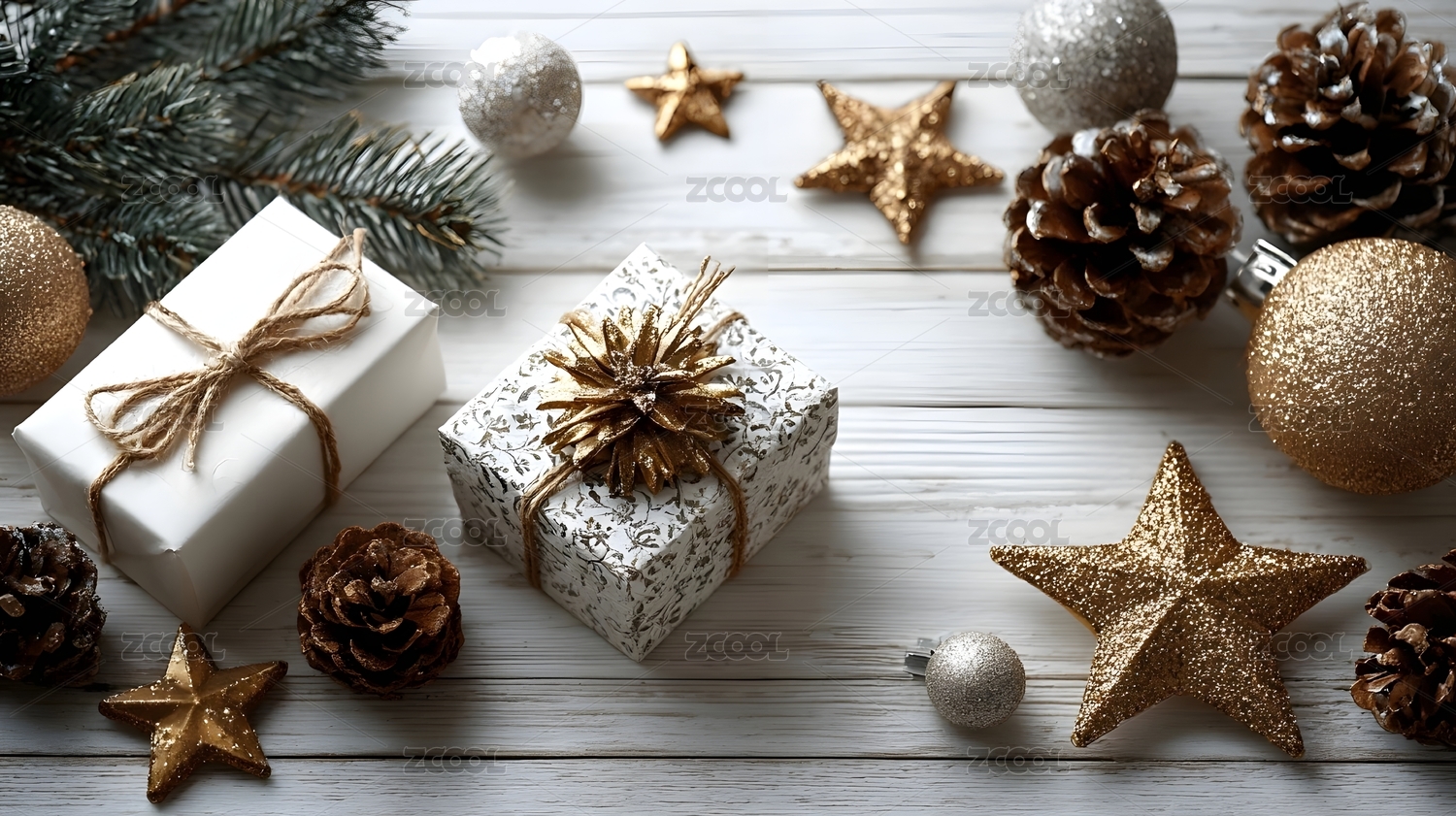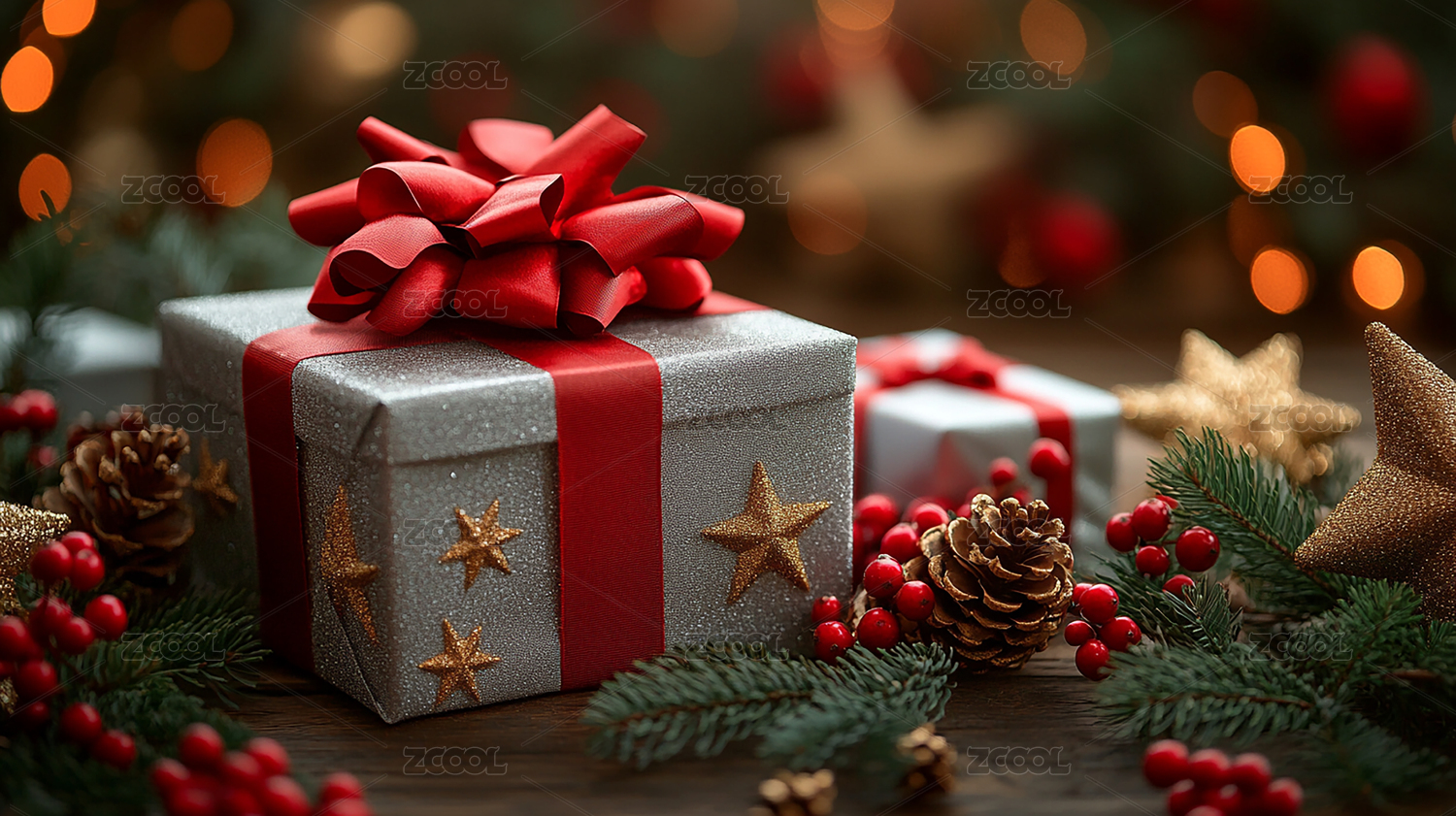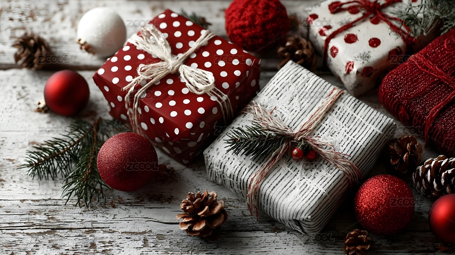 绿叶,木板,红色,红果,白色,节日,礼物,蝴蝶结,松果,圣诞树