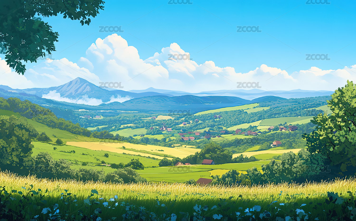 夏天户外旅行山峰房屋乡村风景蓝天白云插画
