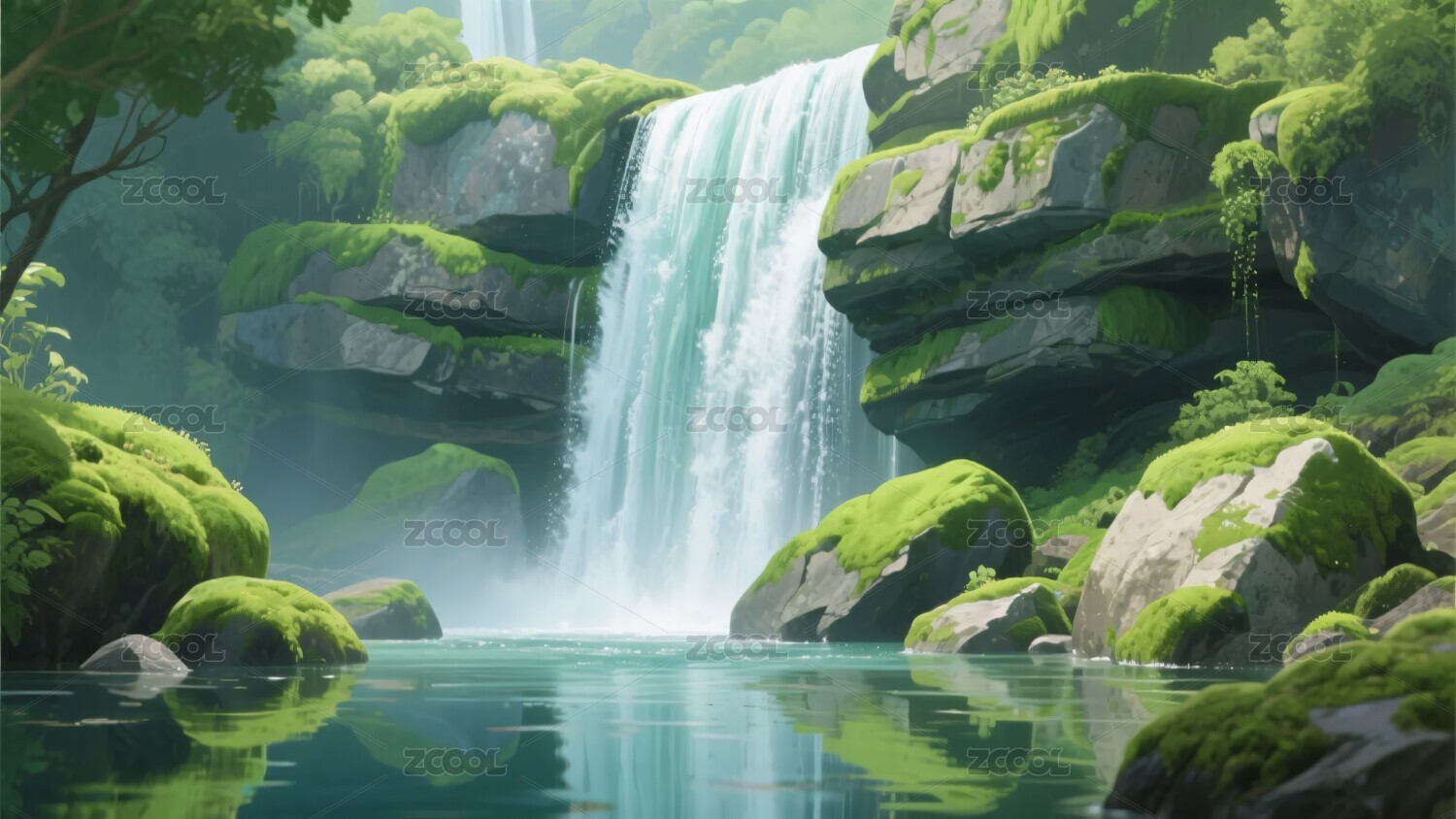森林瀑布风景插画