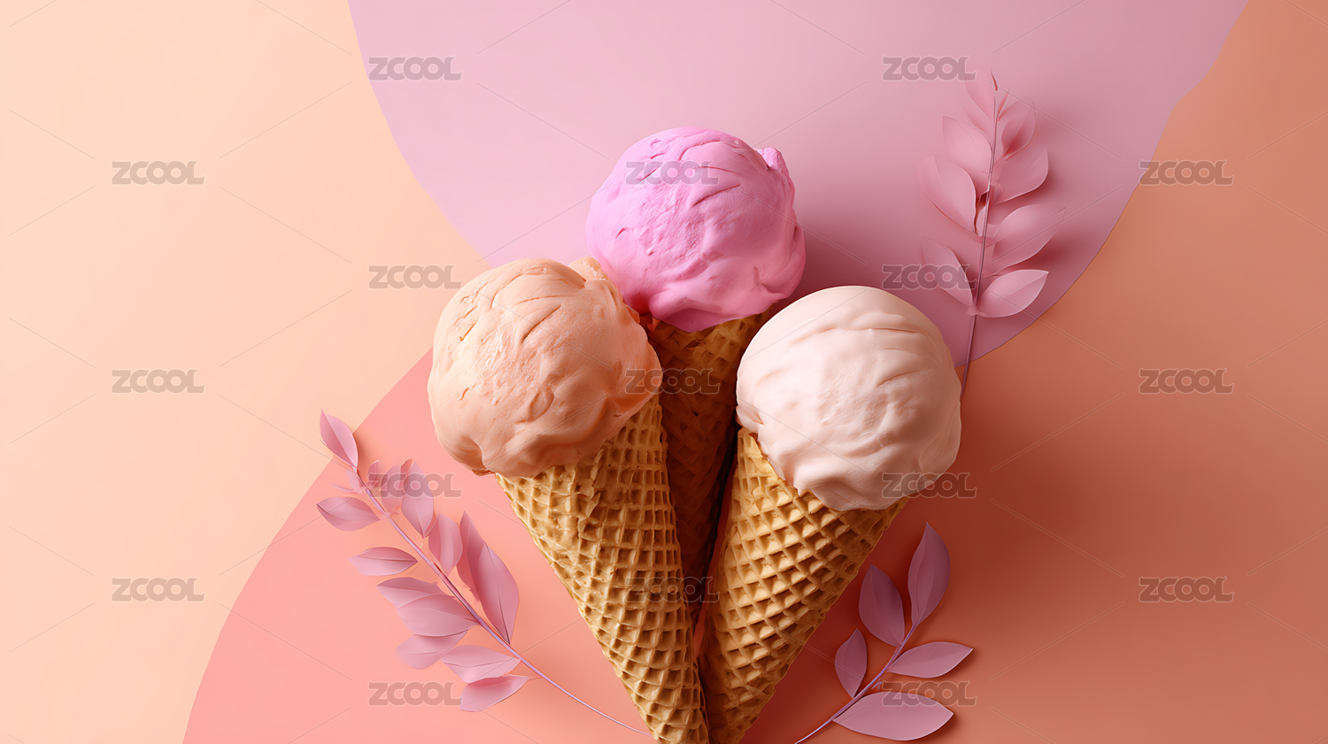 彩色冰淇淋甜筒 柔和粉色背景