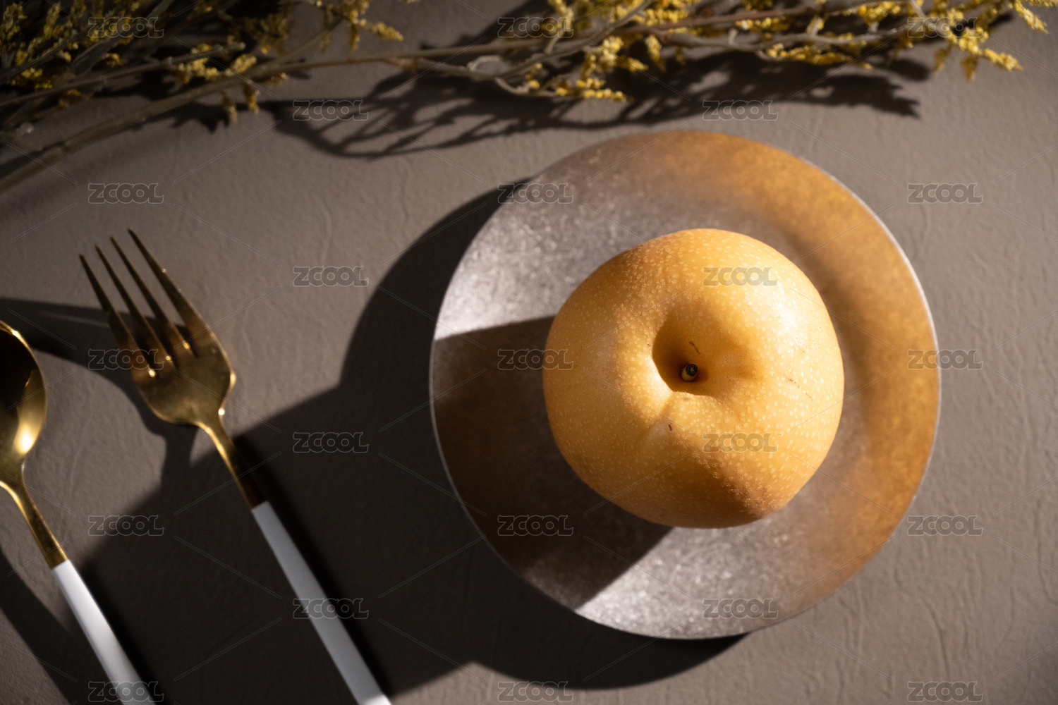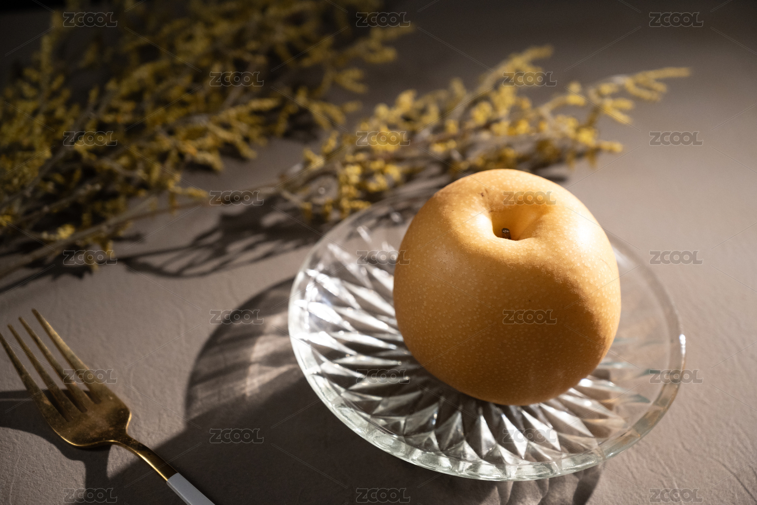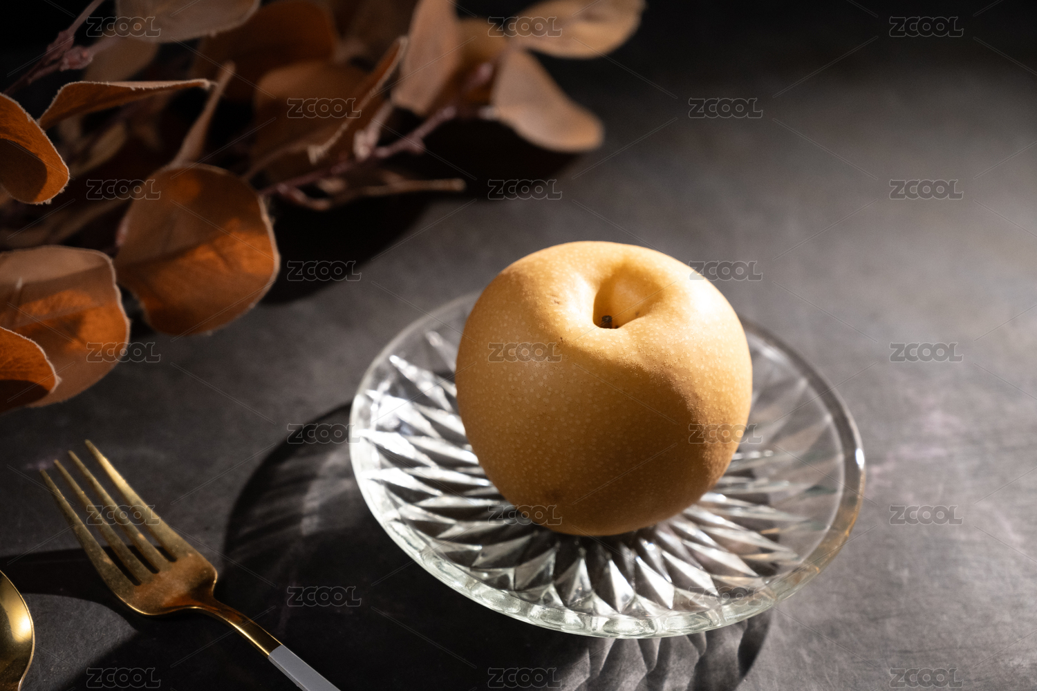 桌面上的盘子里的美味可口的新鲜秋梨