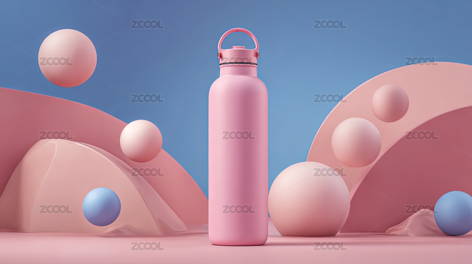 粉色水瓶,梦幻背景,柔和色调,温馨舒适,家居用品,装饰品,简约设计,金属提手,球形点缀,渐变色彩