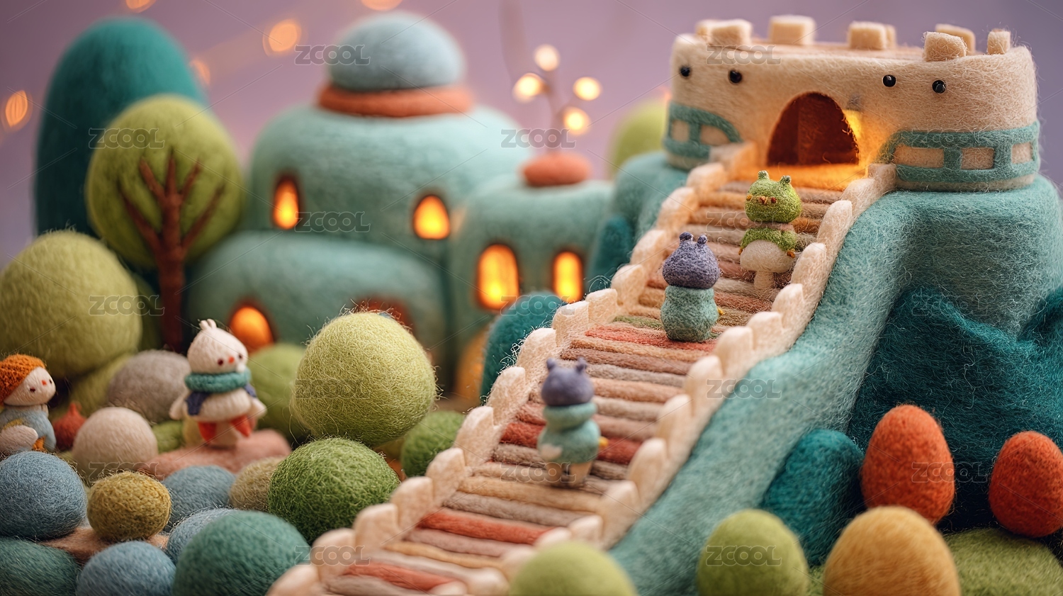 毛毡建筑,微型场景,童话世界,兔子雕像,温馨氛围,梦幻装饰,手工艺术,创意设计,儿童玩具,家居装饰