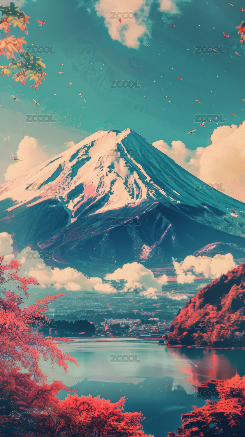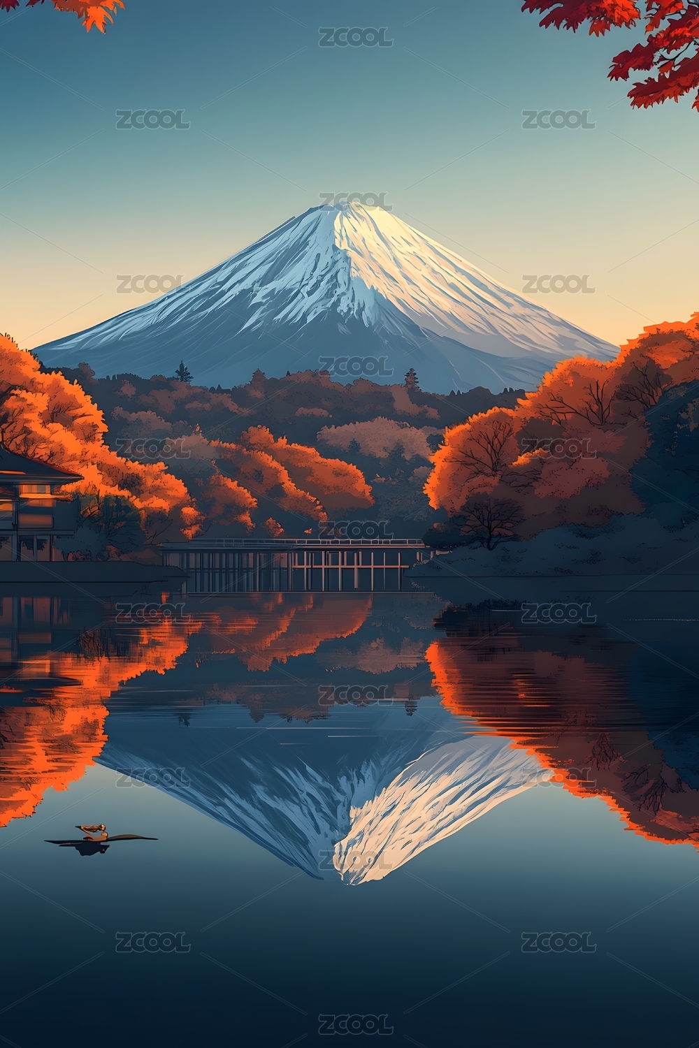 富士山,湖泊,红叶,秋日,风景,插画,自然,美景,山水,云雾