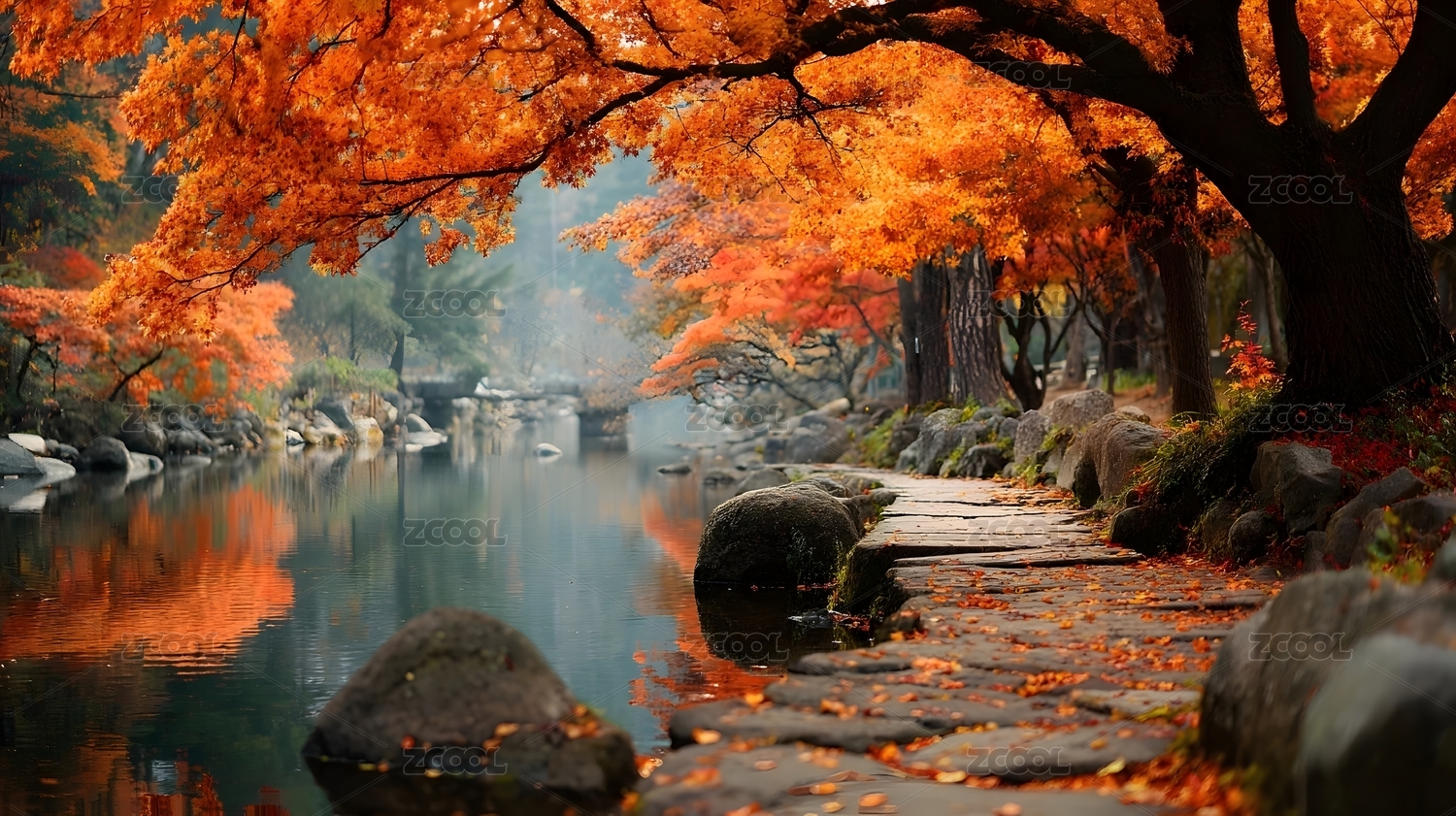 石桥,溪流,树木,枫叶,秋景,插画,自然,风景,雾气,落叶