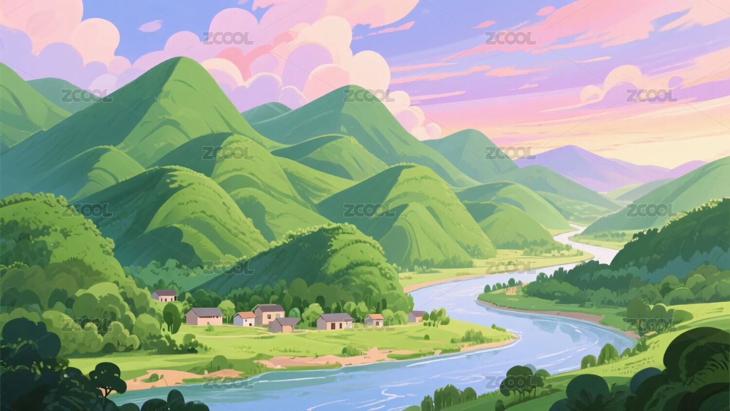 山水,河流,山脉,草地,树木,田园,风景,自然,艺术,插画
