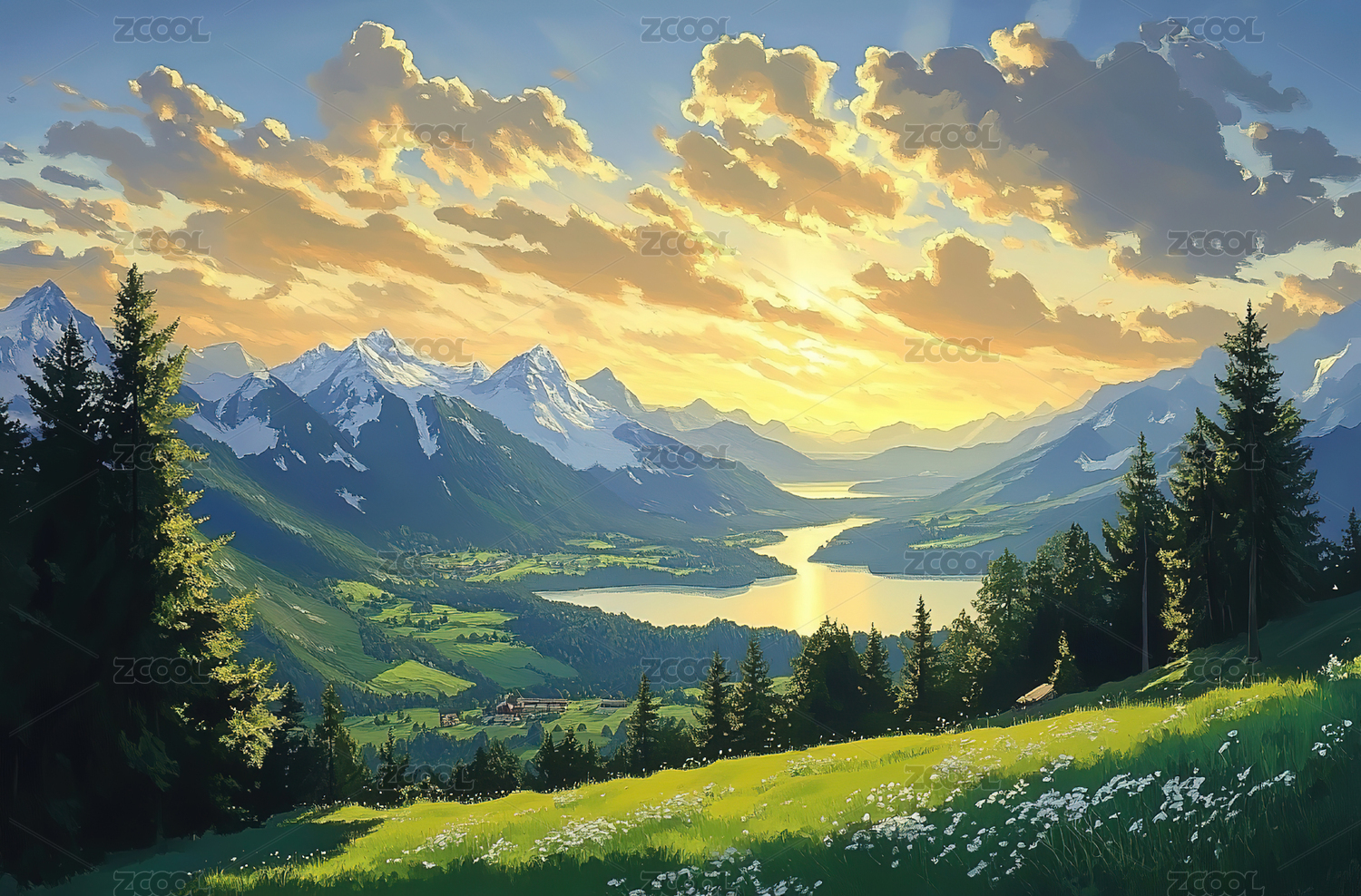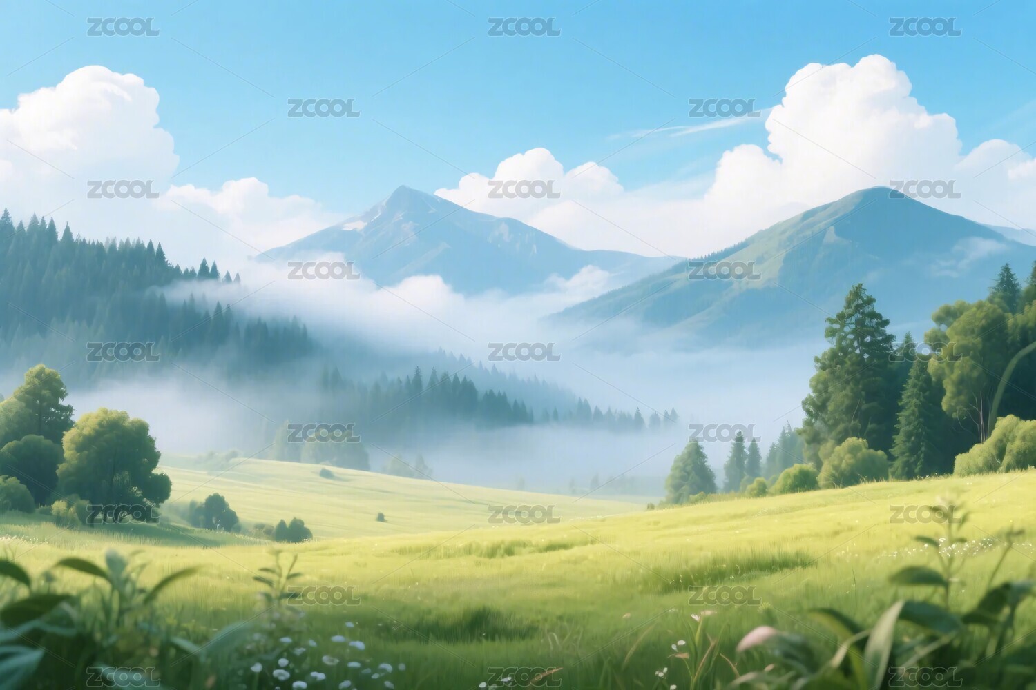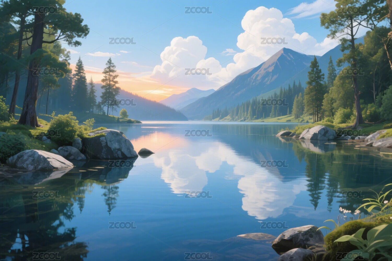 山水,风景,天空,树木,草地,河流,山林,自然,插画,矢量