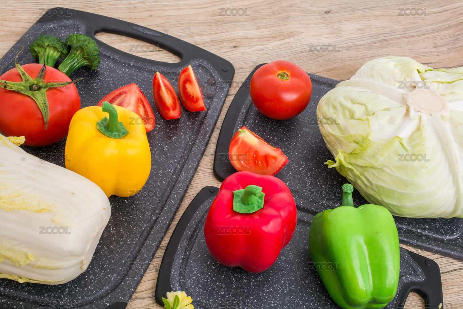 绿色红色撞色的桌面上放着一盘蔬菜沙拉减