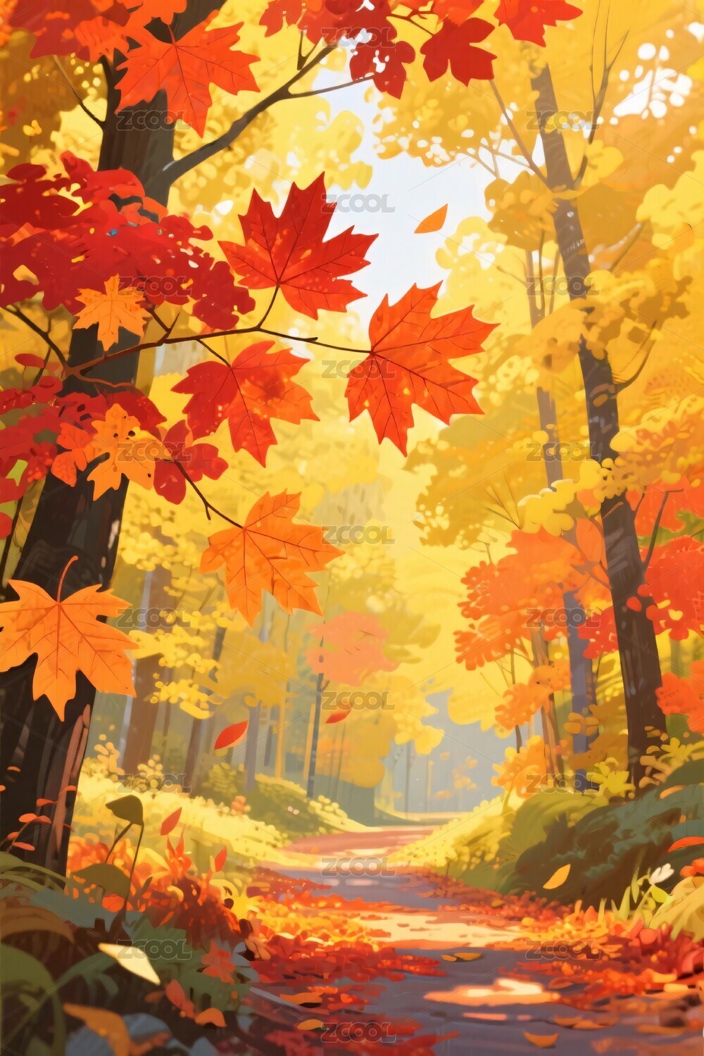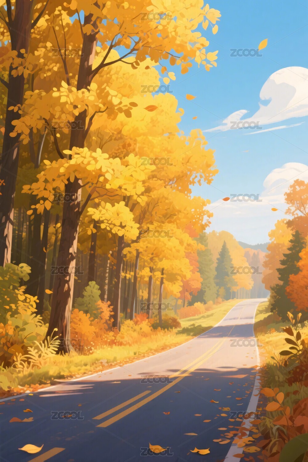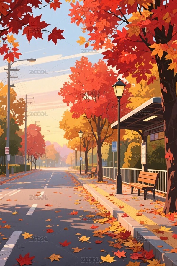 街道,公交站,枫树,落叶,路灯,插画,矢量,风景,秋天,树木