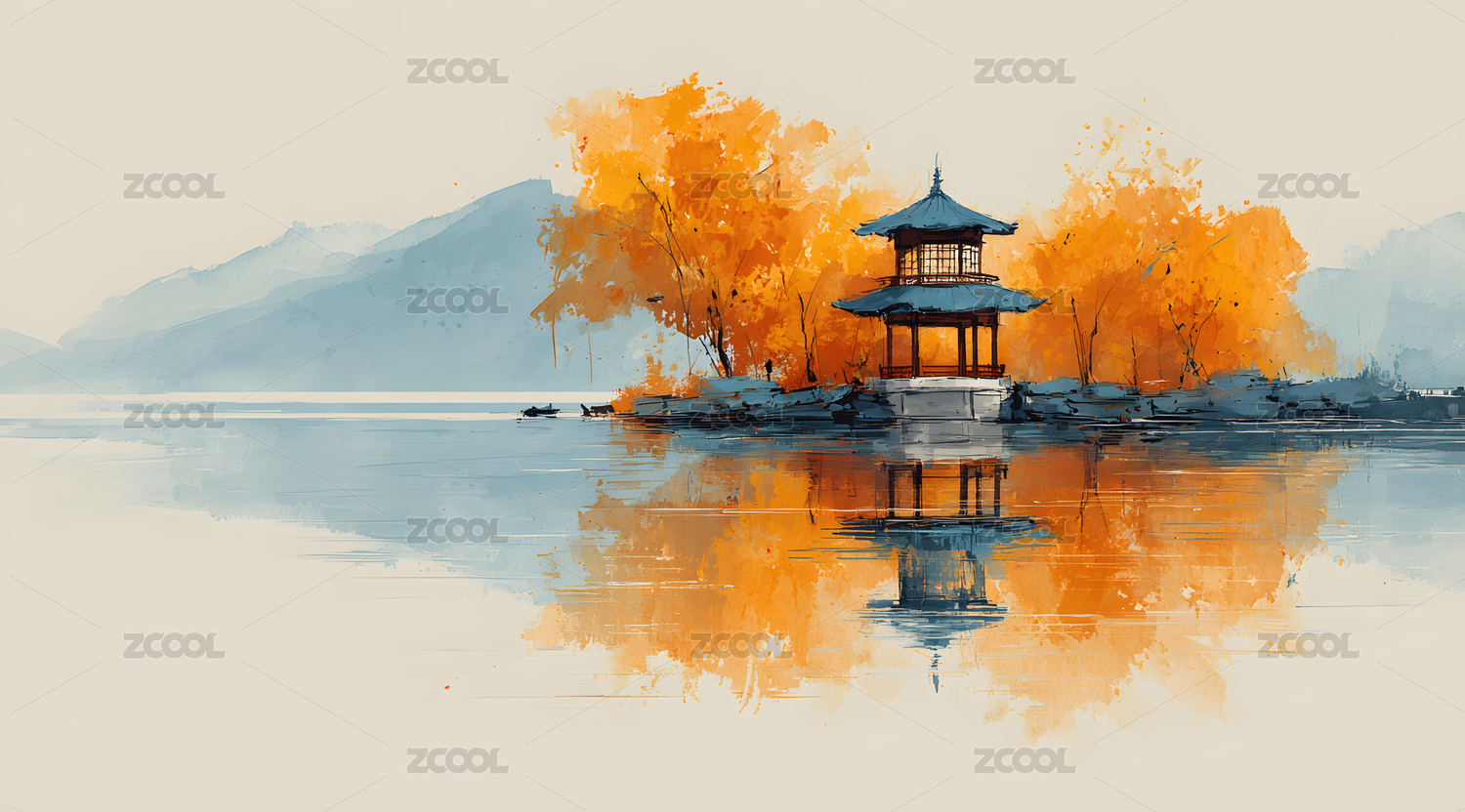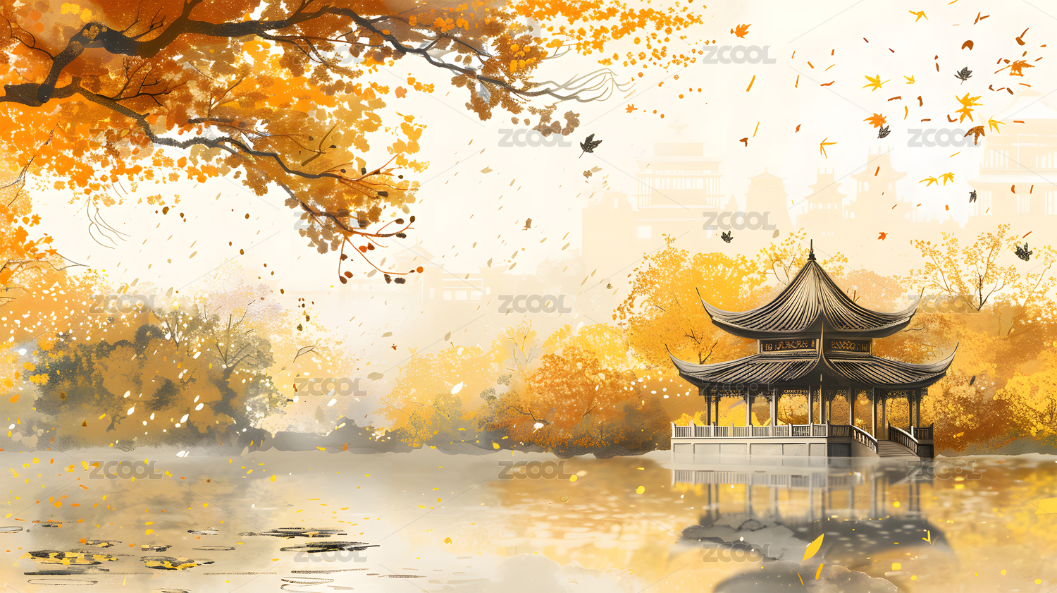 中国风秋天插画建筑凉亭暖色风景壁纸