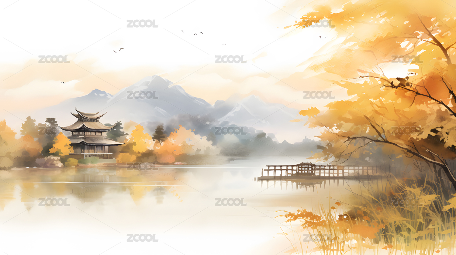 中国水墨画风格江南山水秋天春天拱桥亭子