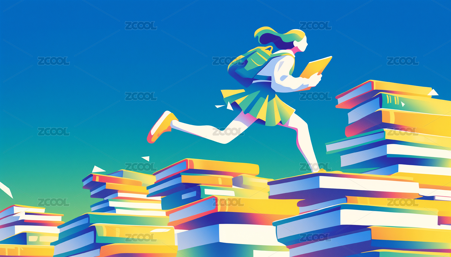 背着书包的少女奔向书籍台阶知识教育插画