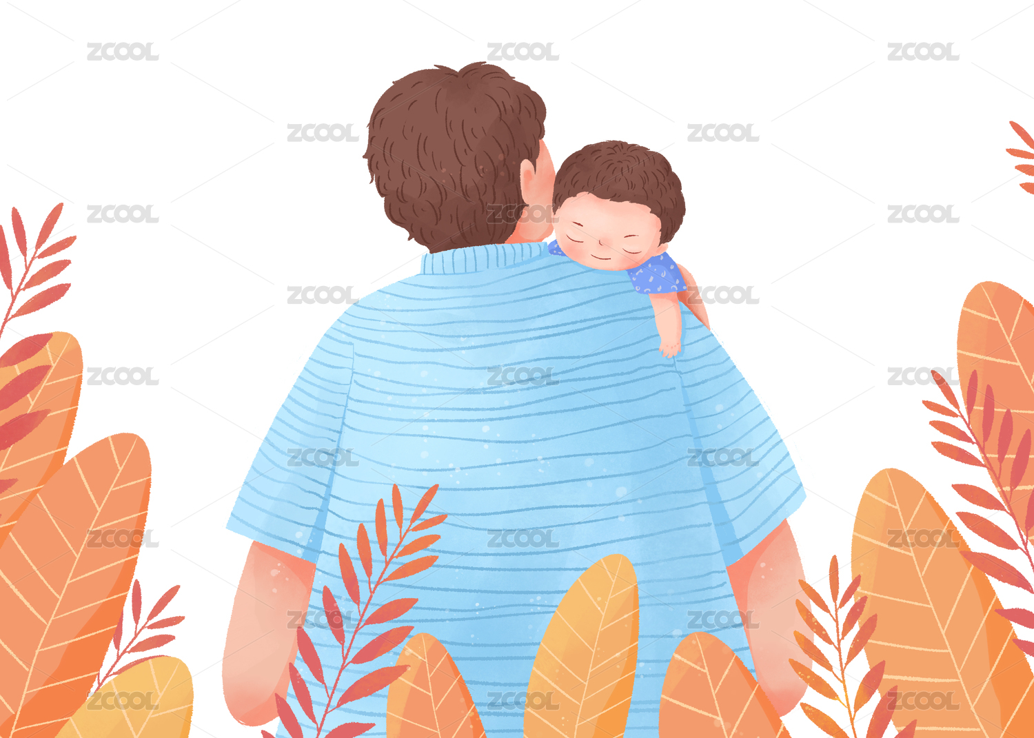 爸爸抱着熟睡婴儿的父亲节插画植物横版白底