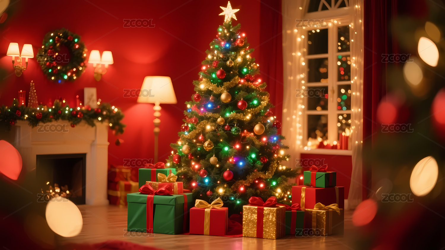 红色,绿色,圣诞树,彩灯,礼物盒,节日,装饰品,温馨,室内,灯光