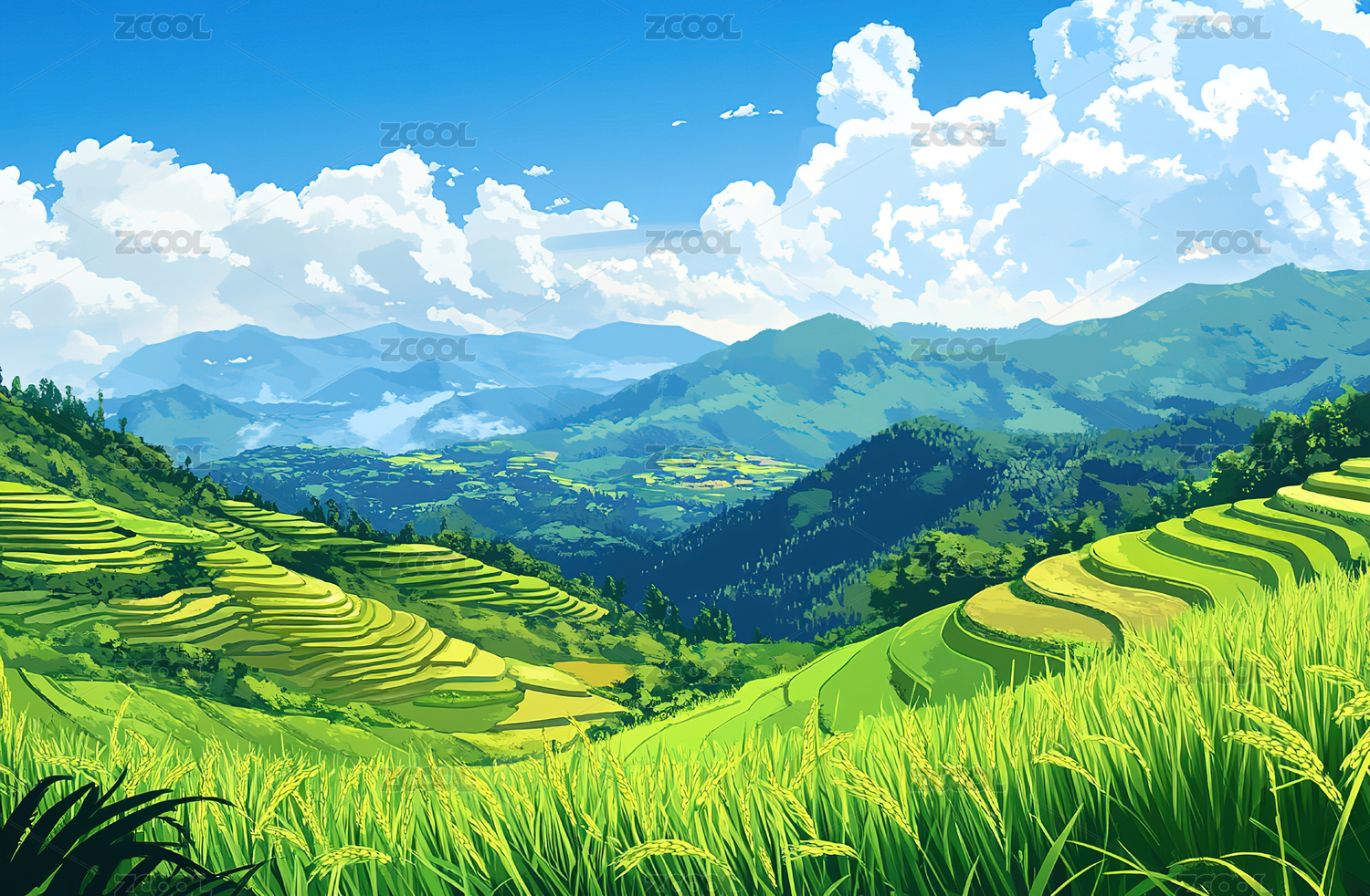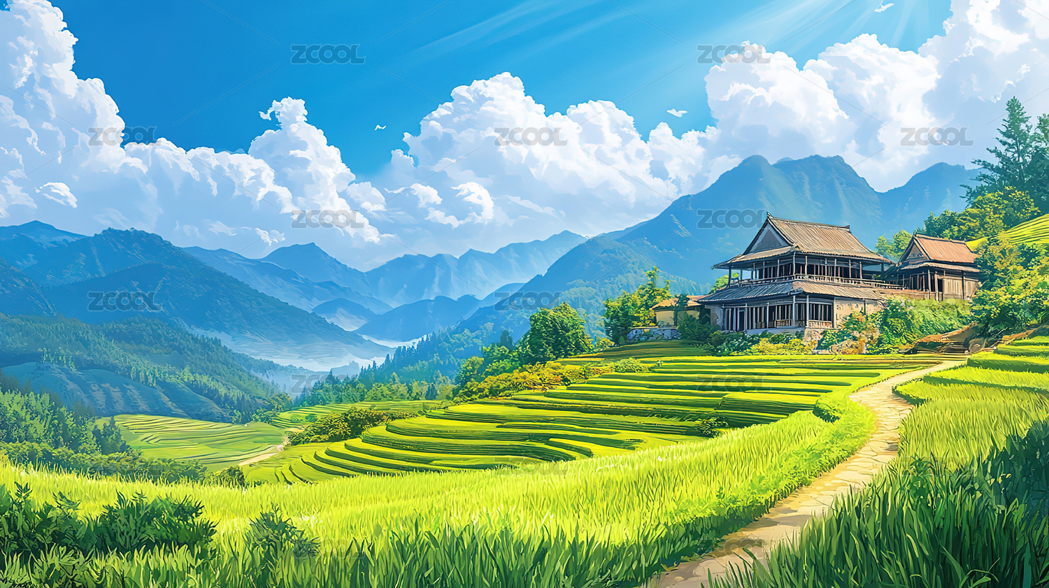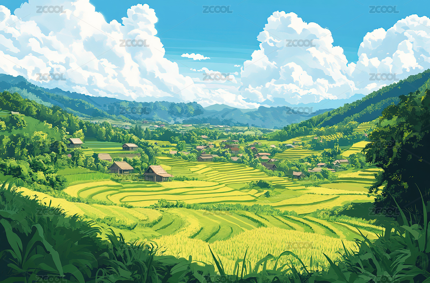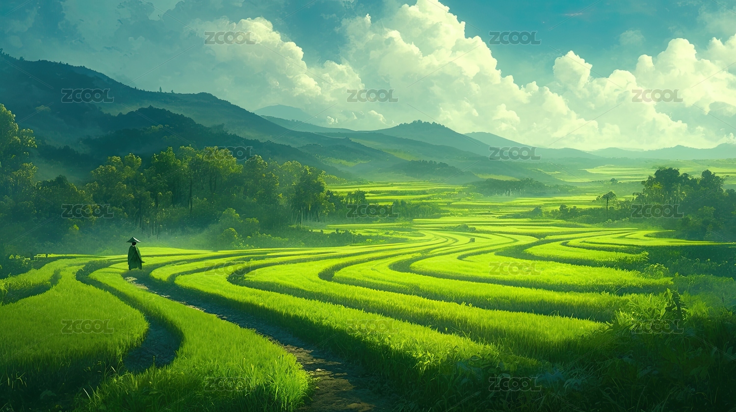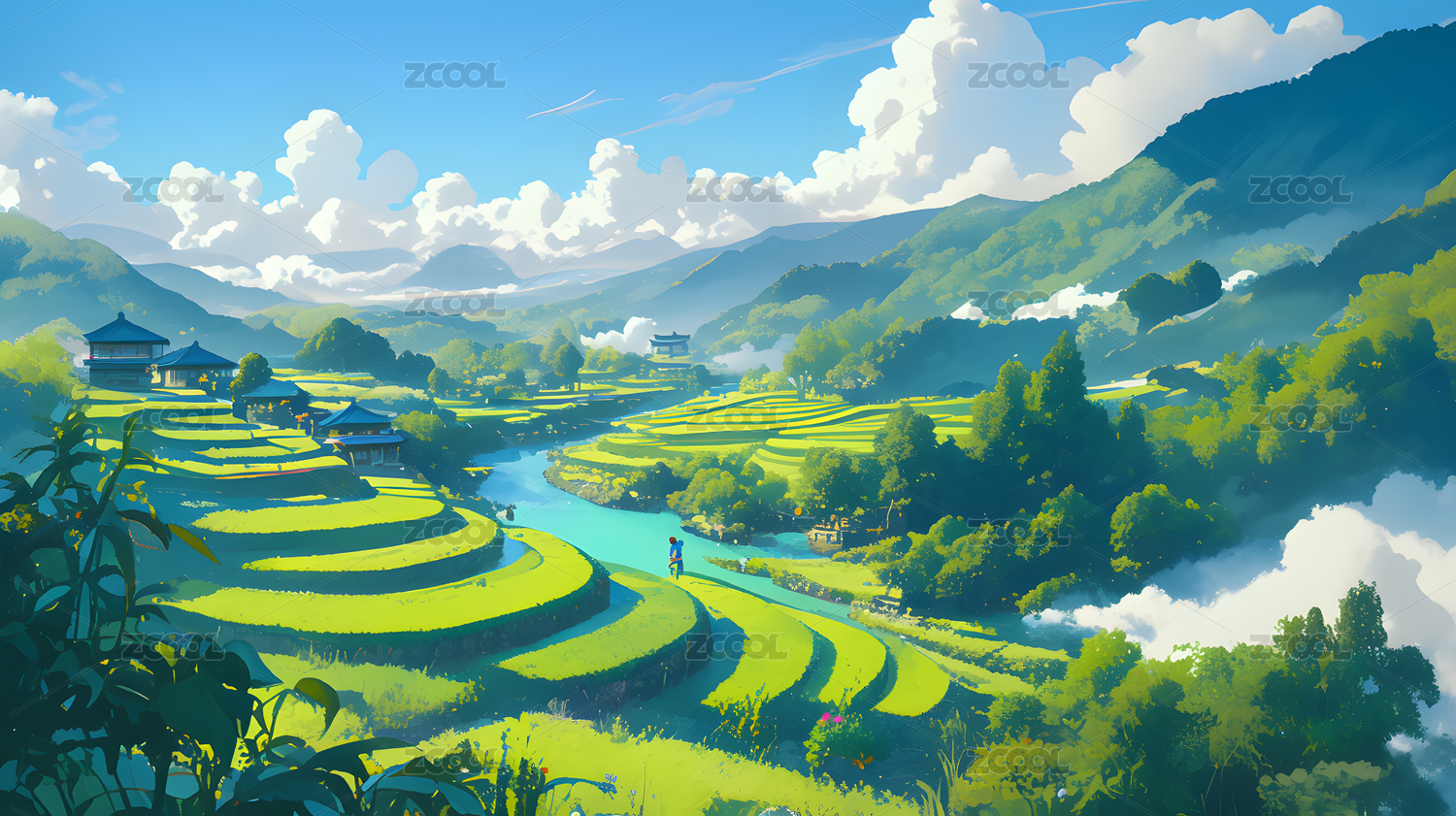 治愈系童话绘本风格郊外绿色的风景壁纸