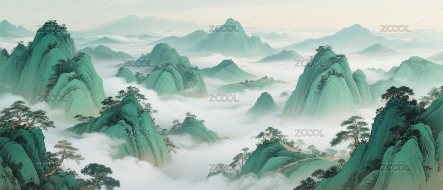 青绿山水国画艺术场景