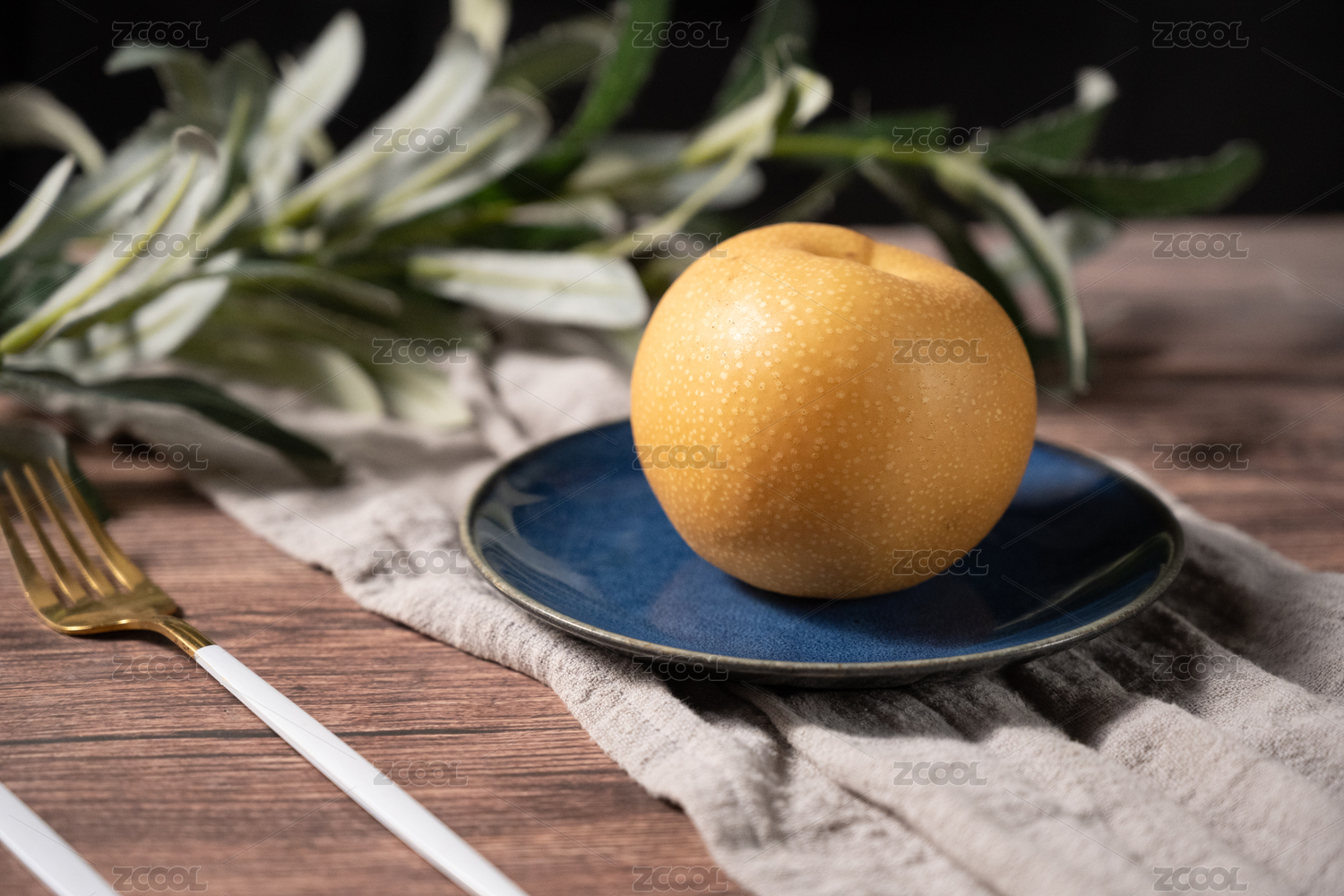 桌面上的盘子里的美味可口的新鲜秋梨