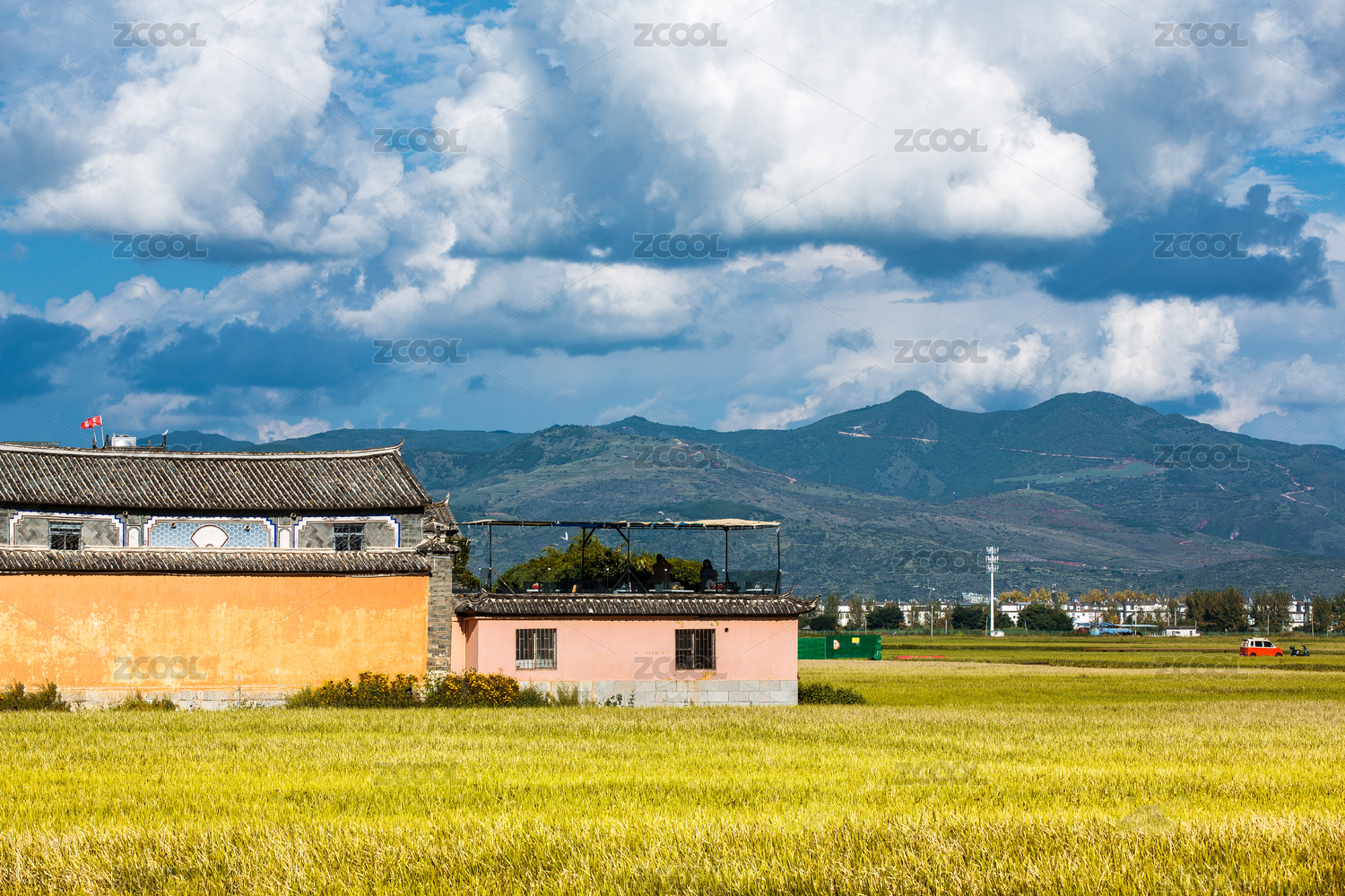 中国云南省大理市喜洲古镇乡间水稻田园风光