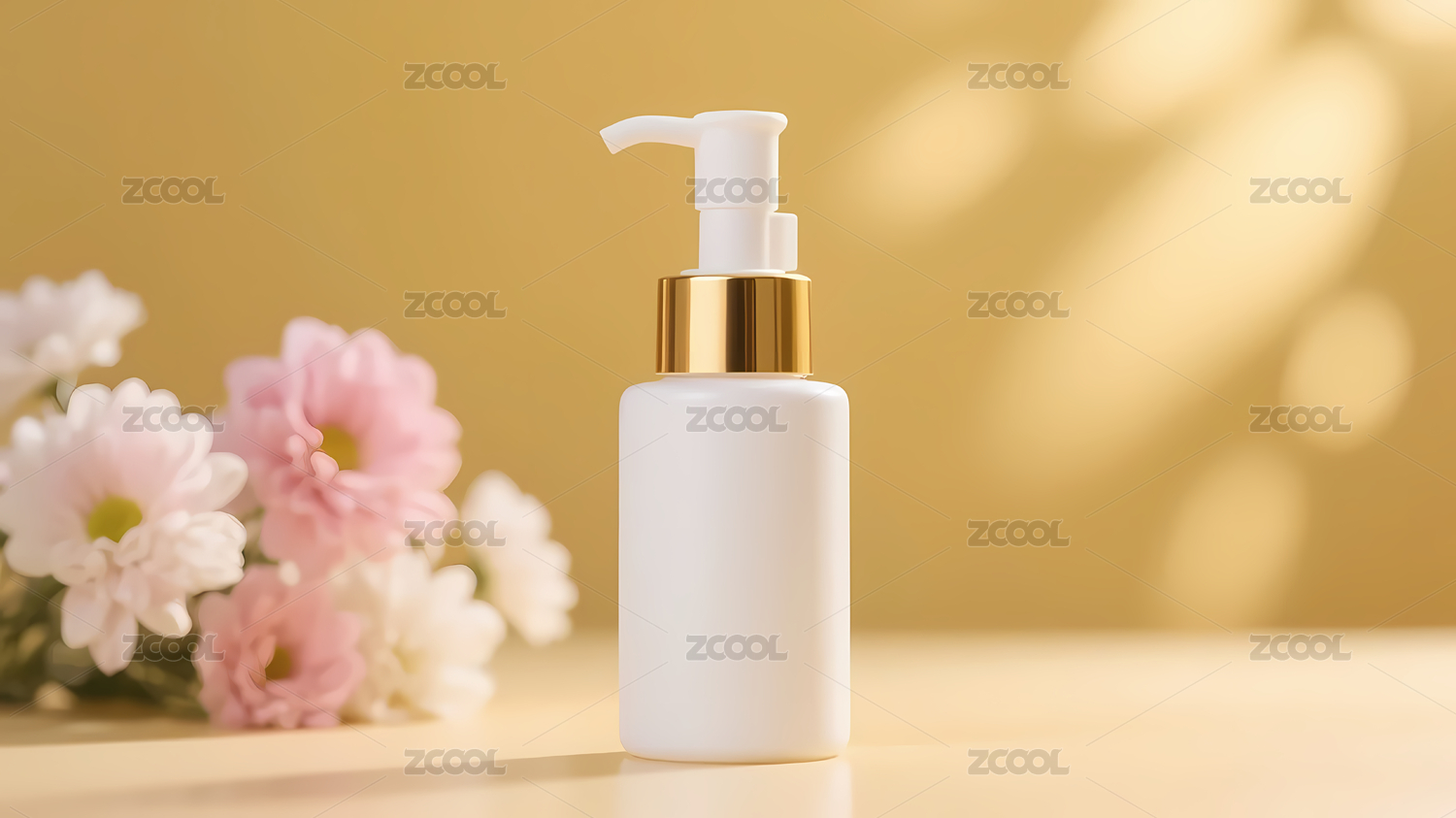 清新,明亮,白色,护肤品,雏菊,金色,瓶子,桌面,墙面,叶子