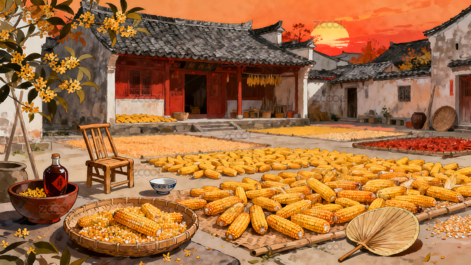 农家小院秋收图