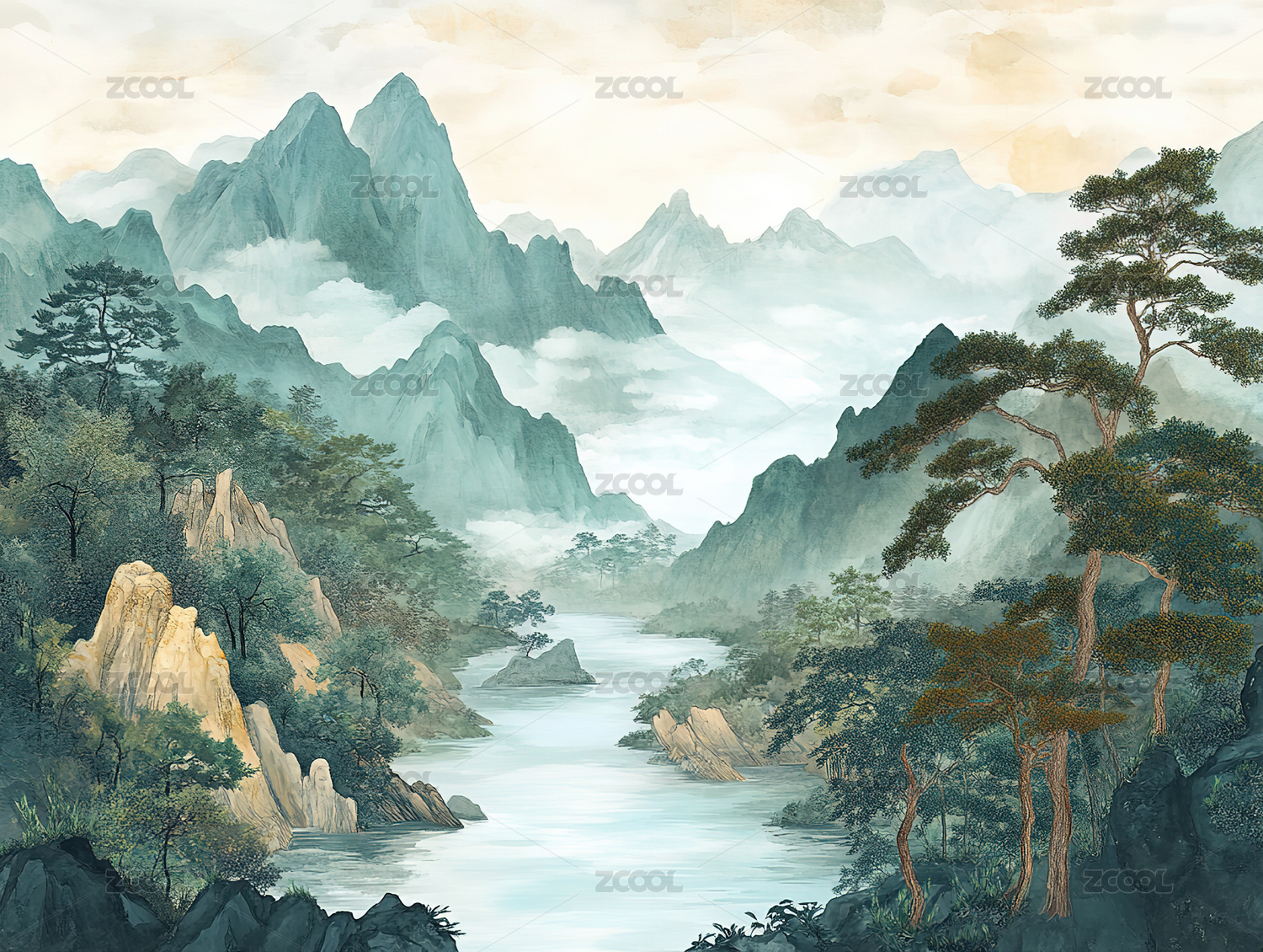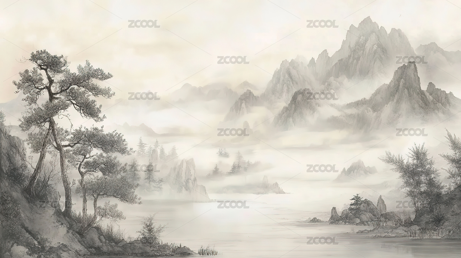 山水画,国画,水墨画,瀑布,山峰,云雾,亭台,中国风,写意,意境