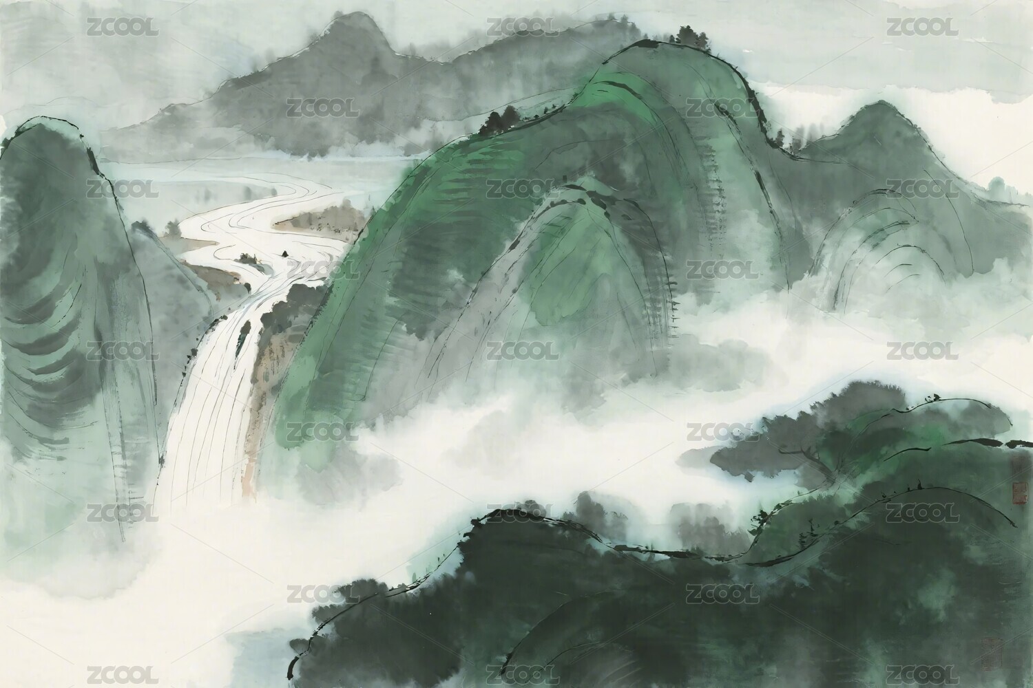 山水画,国画,水墨画,瀑布,山峰,云雾,亭台,中国风,写意,意境