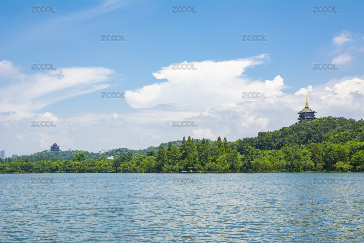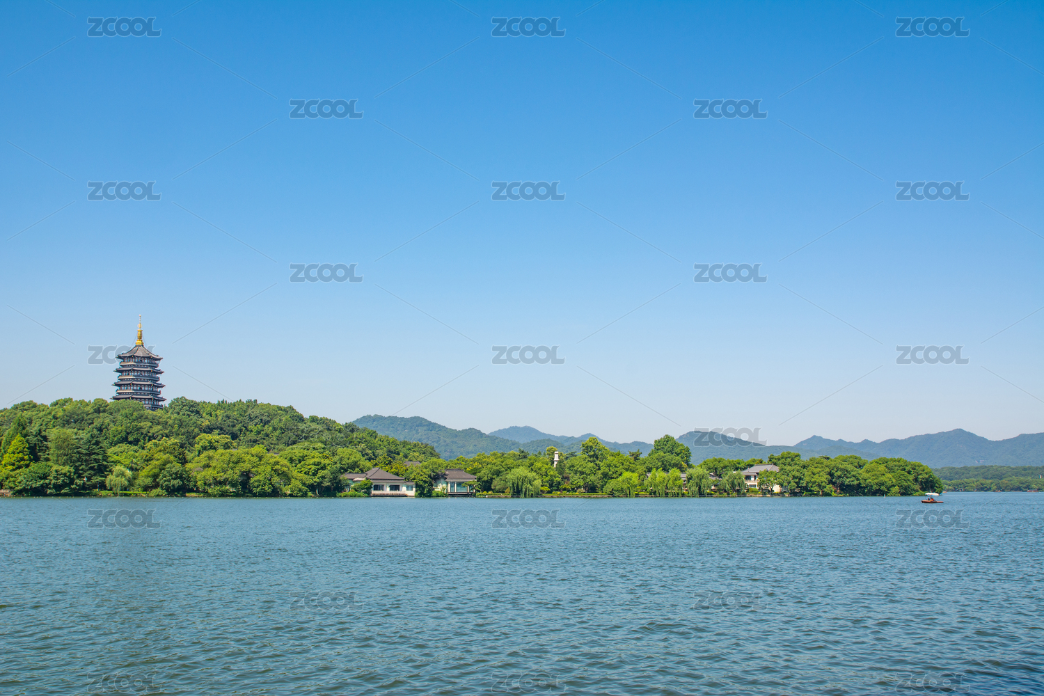 中国浙江杭州西湖夏天雷峰塔 苏堤春晓