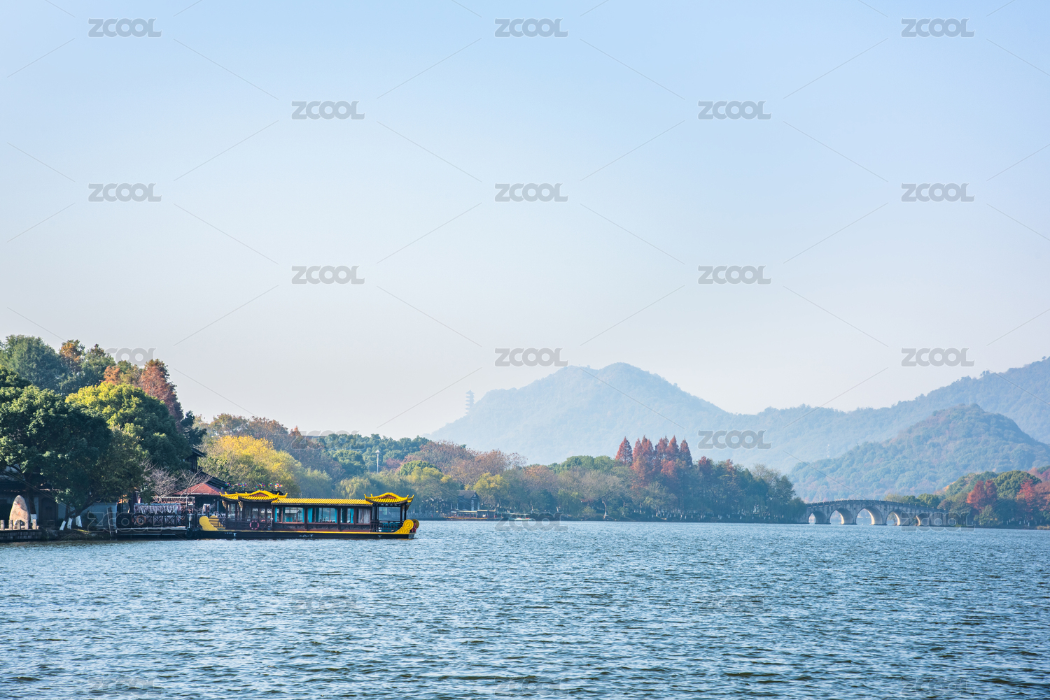 中国浙江杭州西湖边美丽的风景和惬意的人群