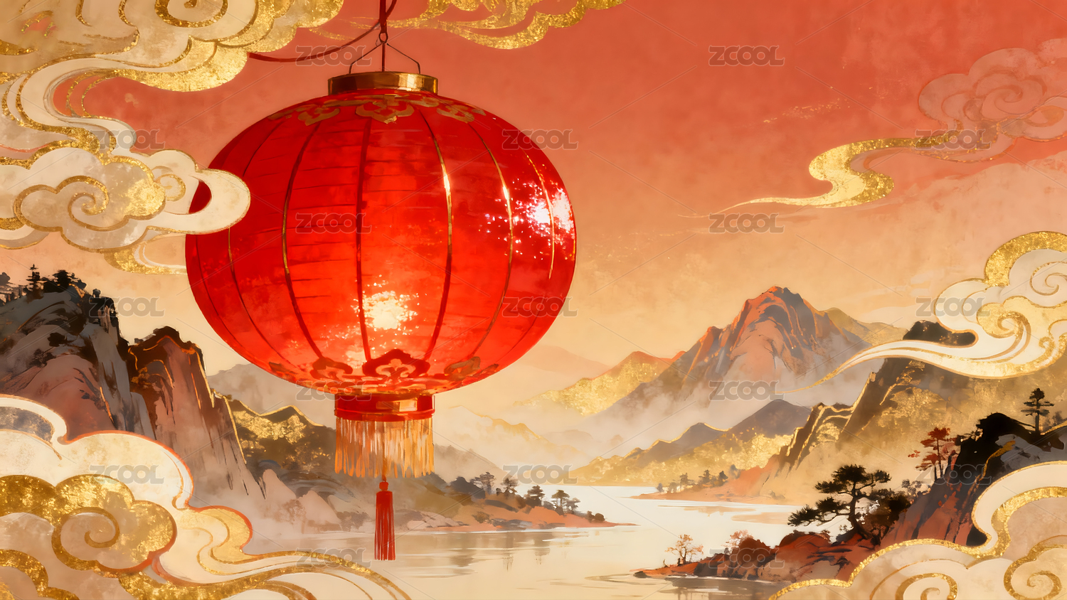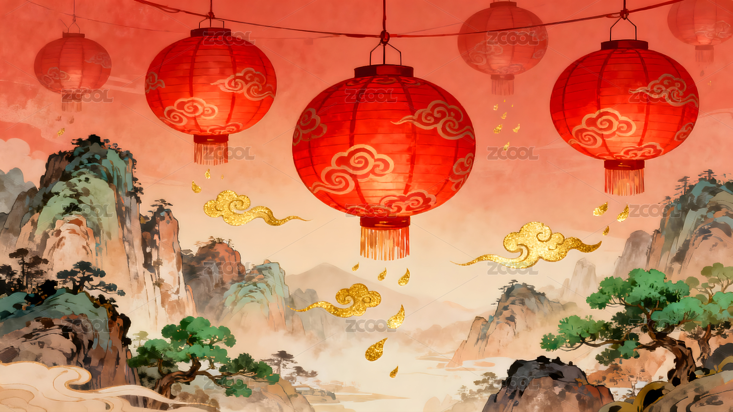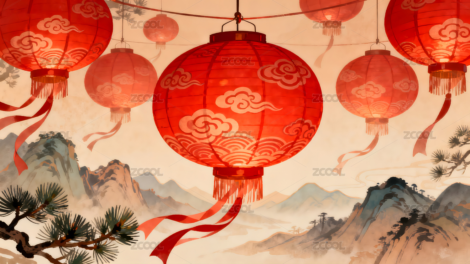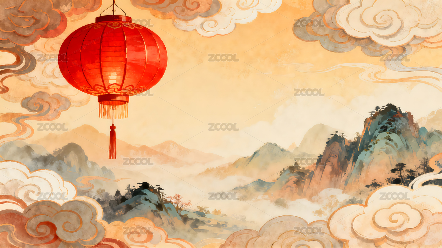 灯笼,国风,山水,水墨,祥云,节日,庆典,喜庆,春节,新年