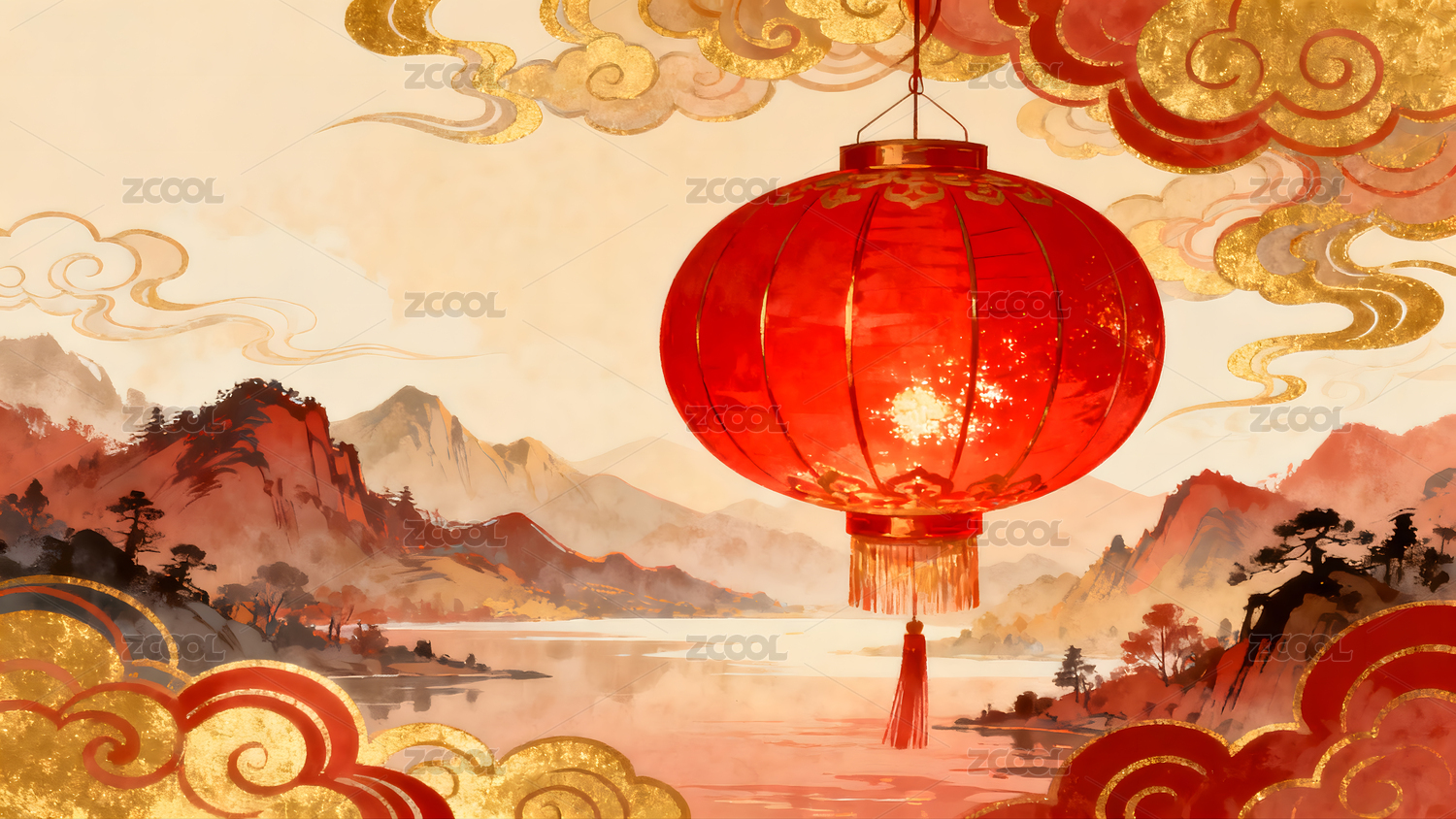 灯笼,国风,山水,水墨,祥云,节日,庆典,喜庆,春节,新年