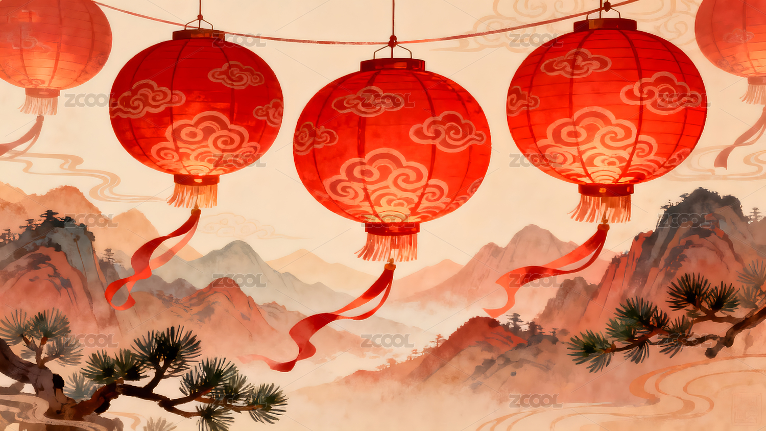 红灯笼,国风,水墨,山水,中国风,传统,文化,节日,喜庆,祥云