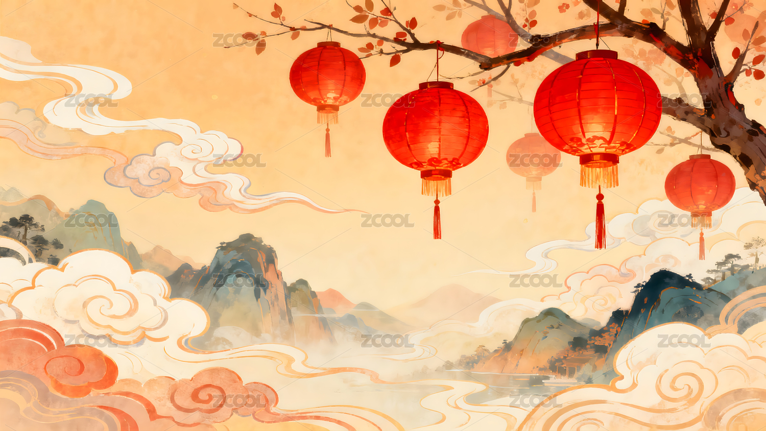 灯笼,国风,祥云,庆典,新春,节日,中国风,传统,意境,山水