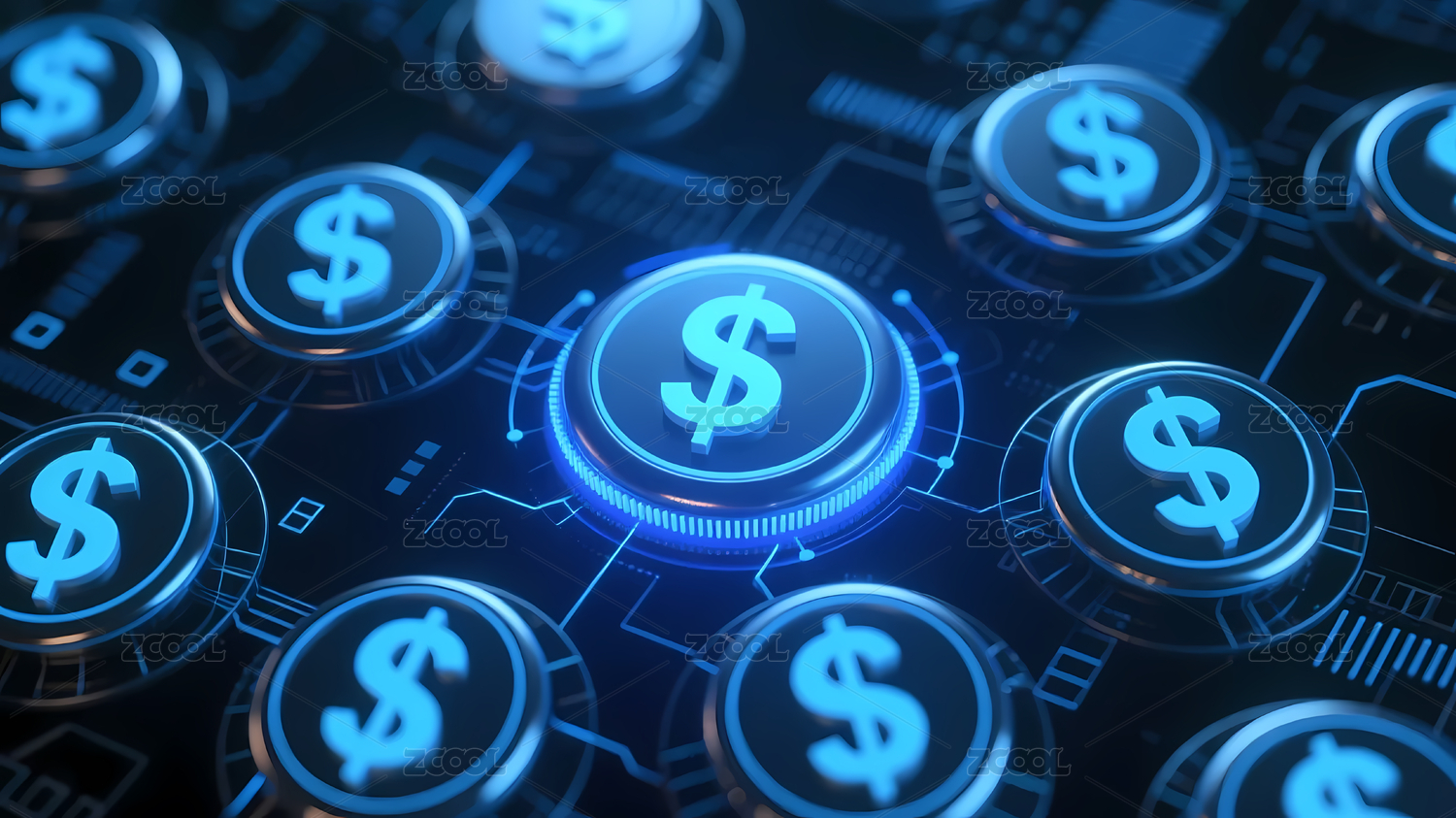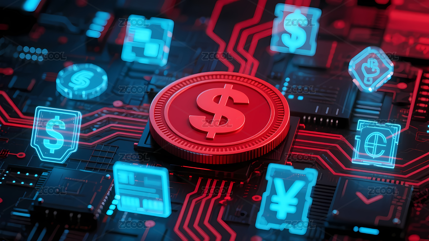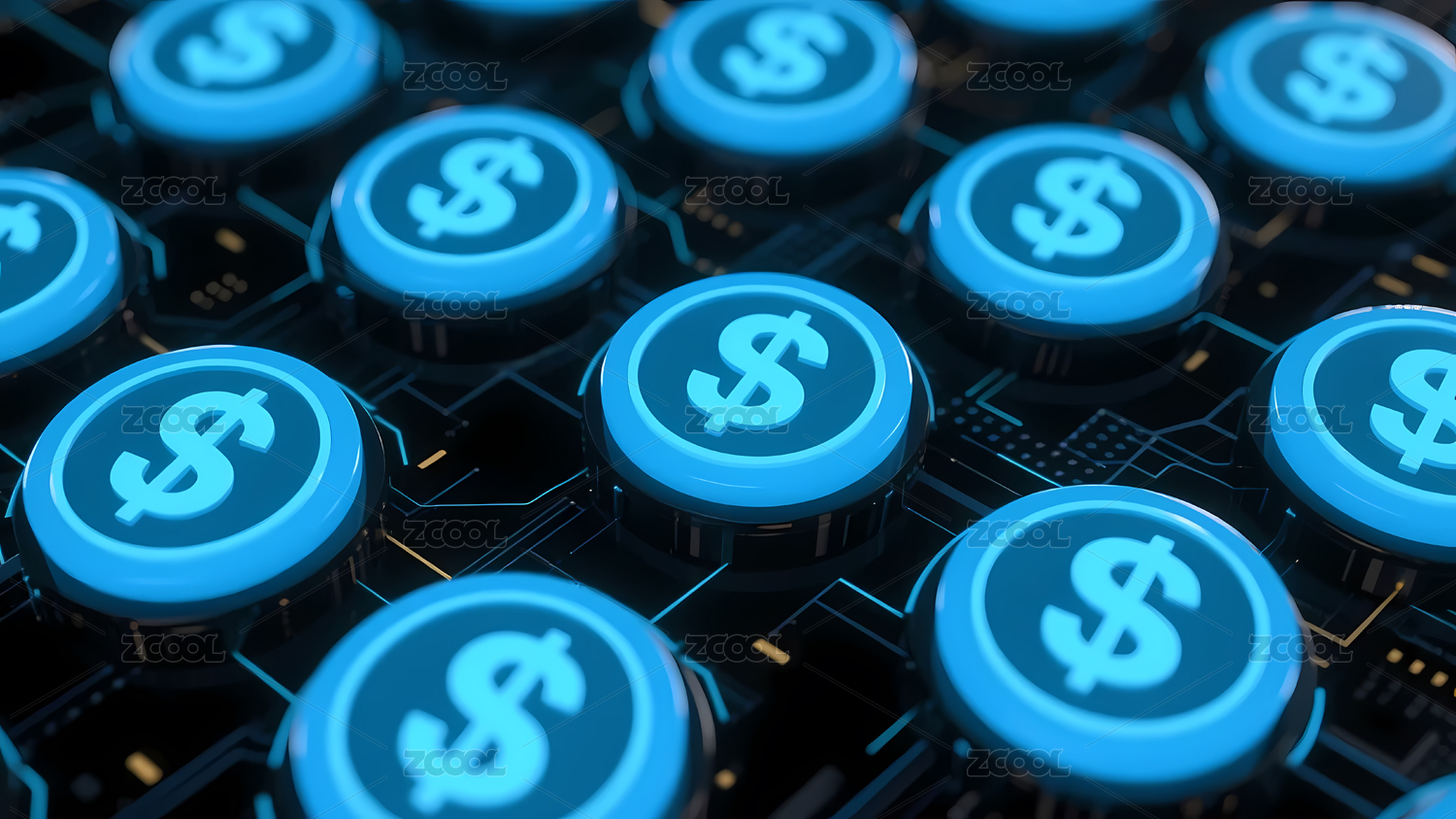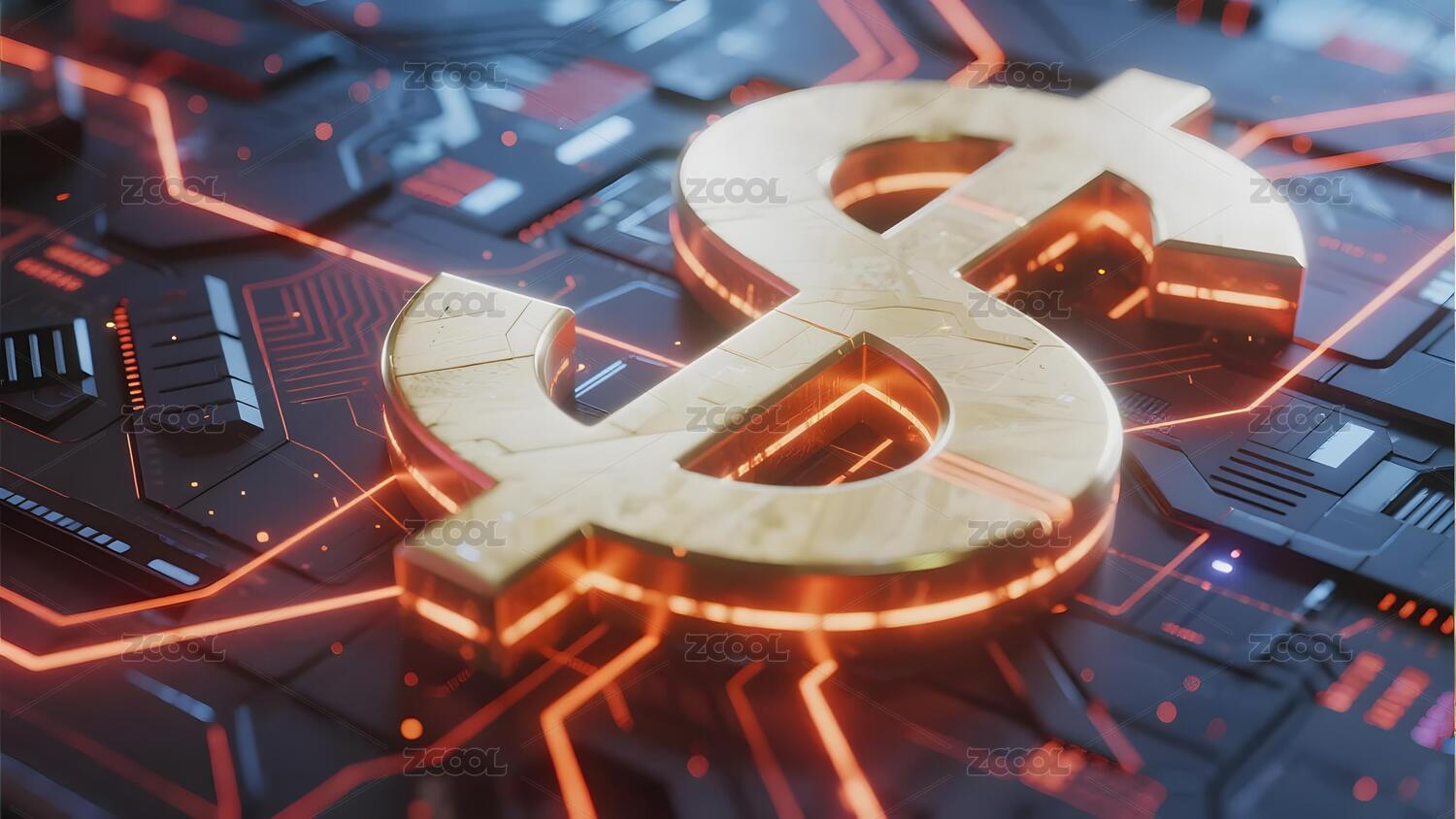美元符号组成的电路板与立方体阵列,代表着数据的存储与金融电子科技