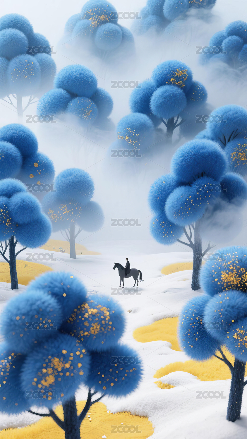 树木,马,梦幻,薄雾,蓝色,剪影,森林,微景观,冬天,宁静