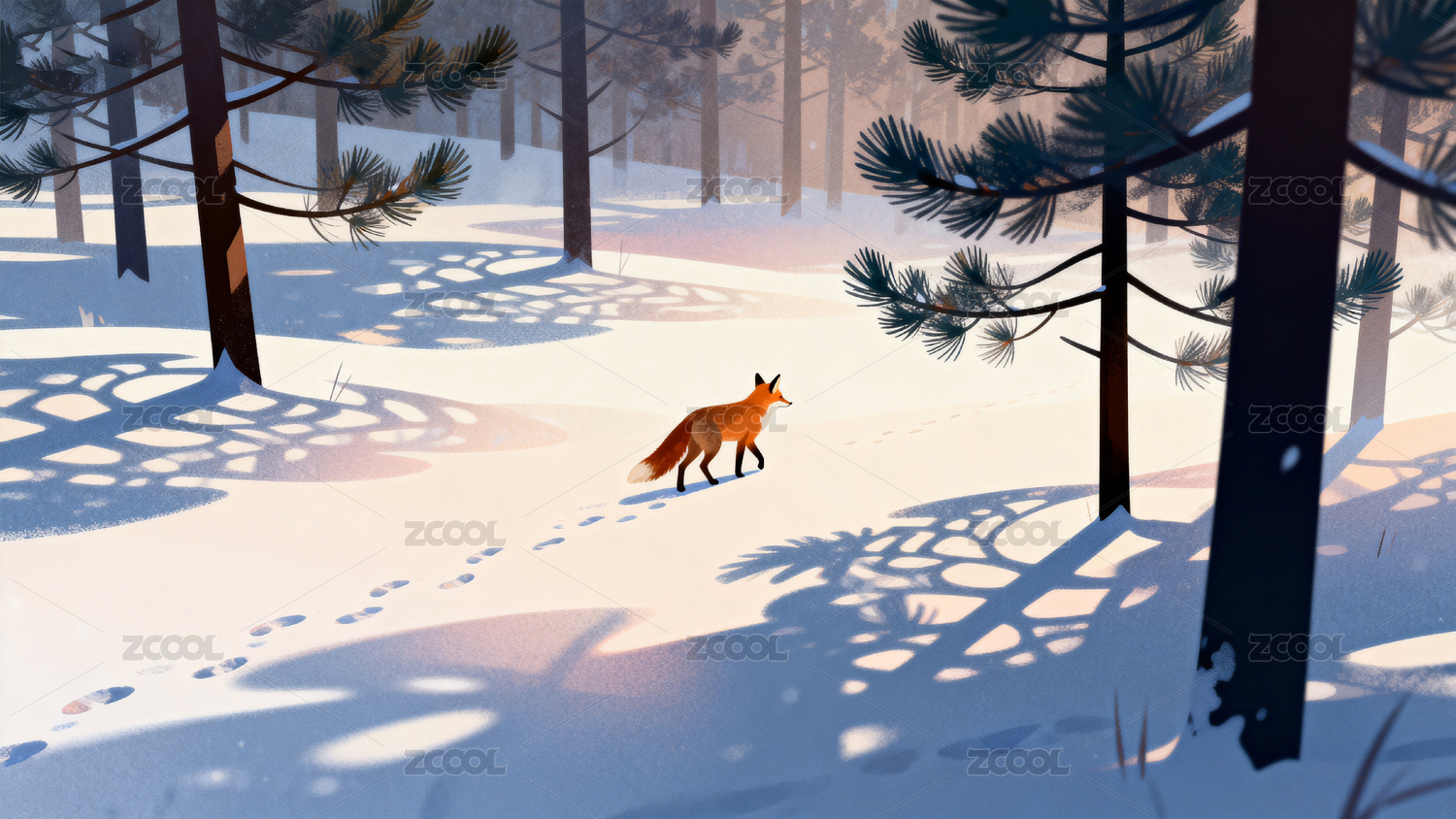 清新明亮冬天有厚厚的积雪的树林插画绘画
