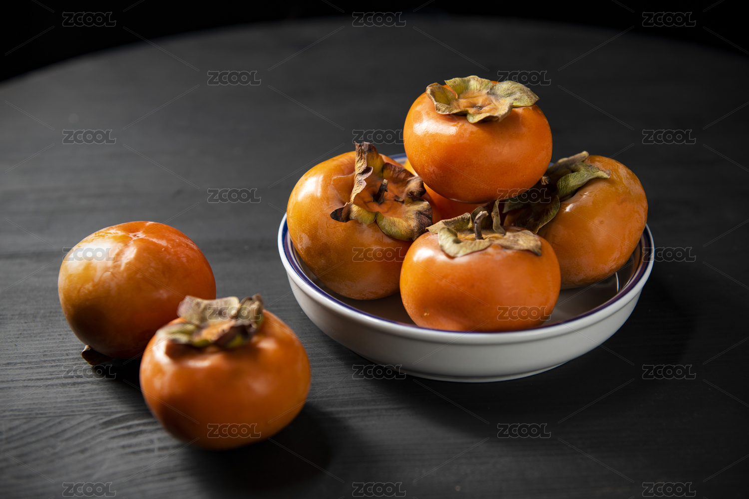 柿子摆放在木桌面上特写深色调