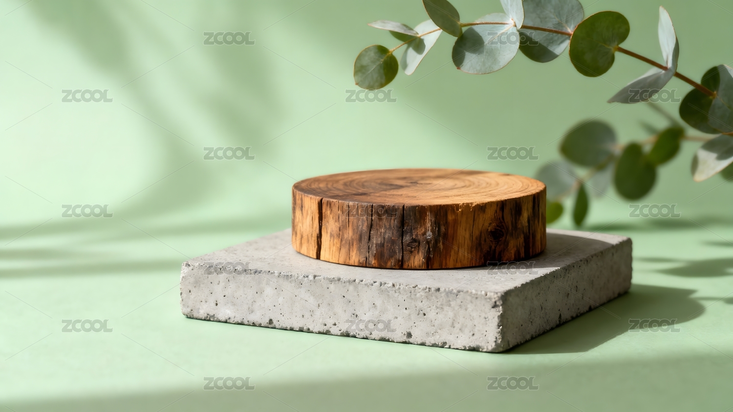 木质圆台置于水泥基座绿背景