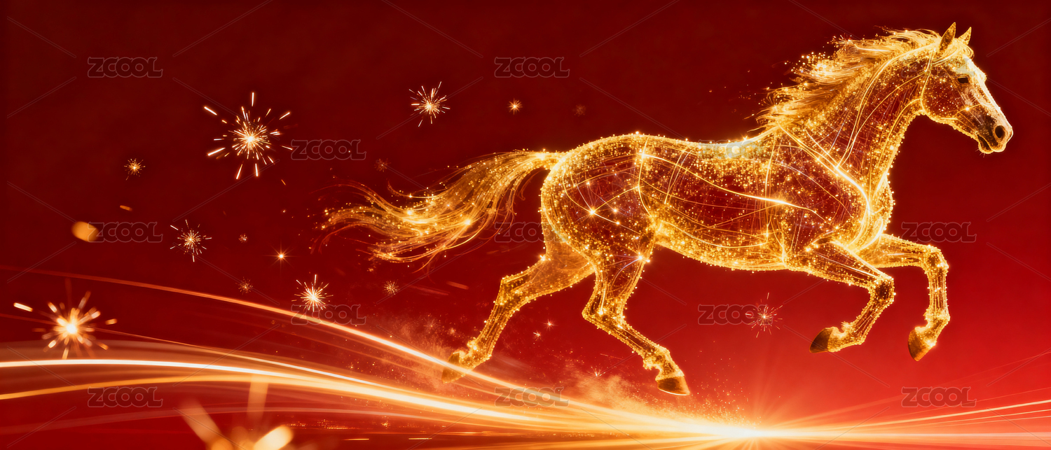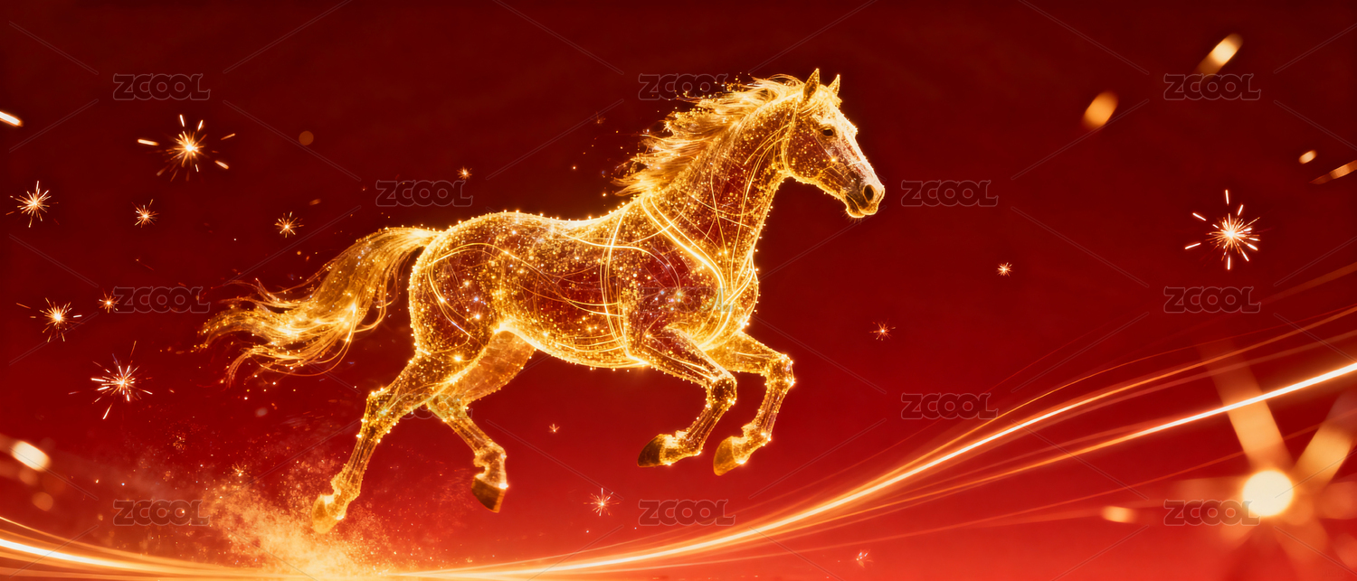 马,鬃毛,尾巴,花纹,奔跑,金色,梦幻,光效,红背景,光点