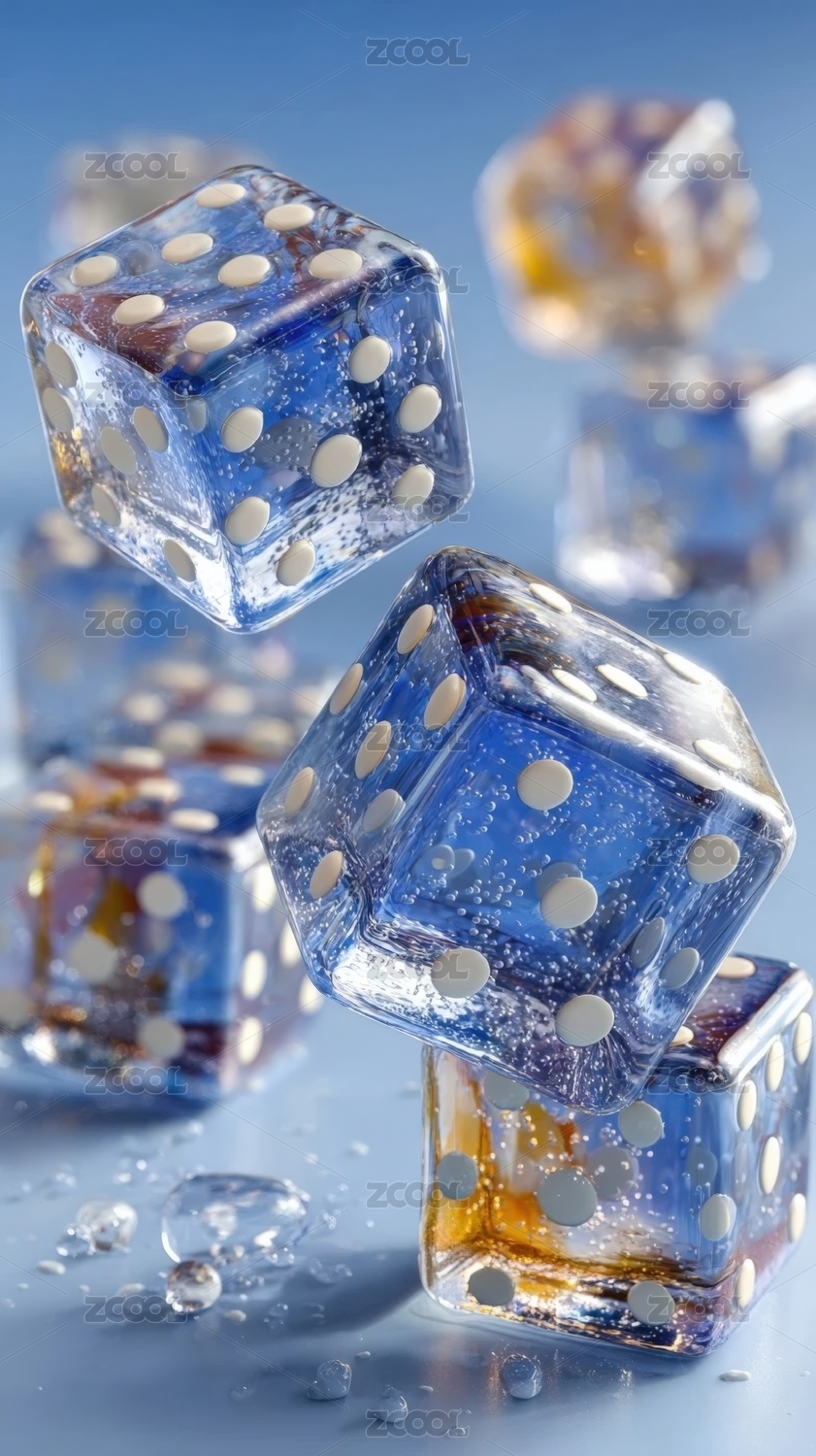 透明蓝色骰子飞舞