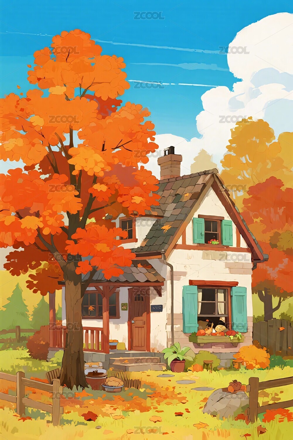 秋日小屋与红叶树