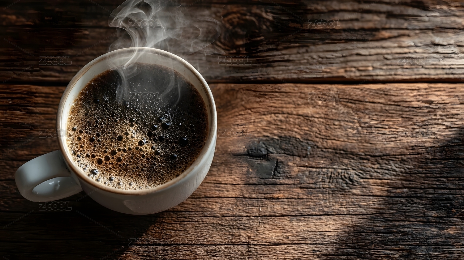 热咖啡在木桌上冒着热气