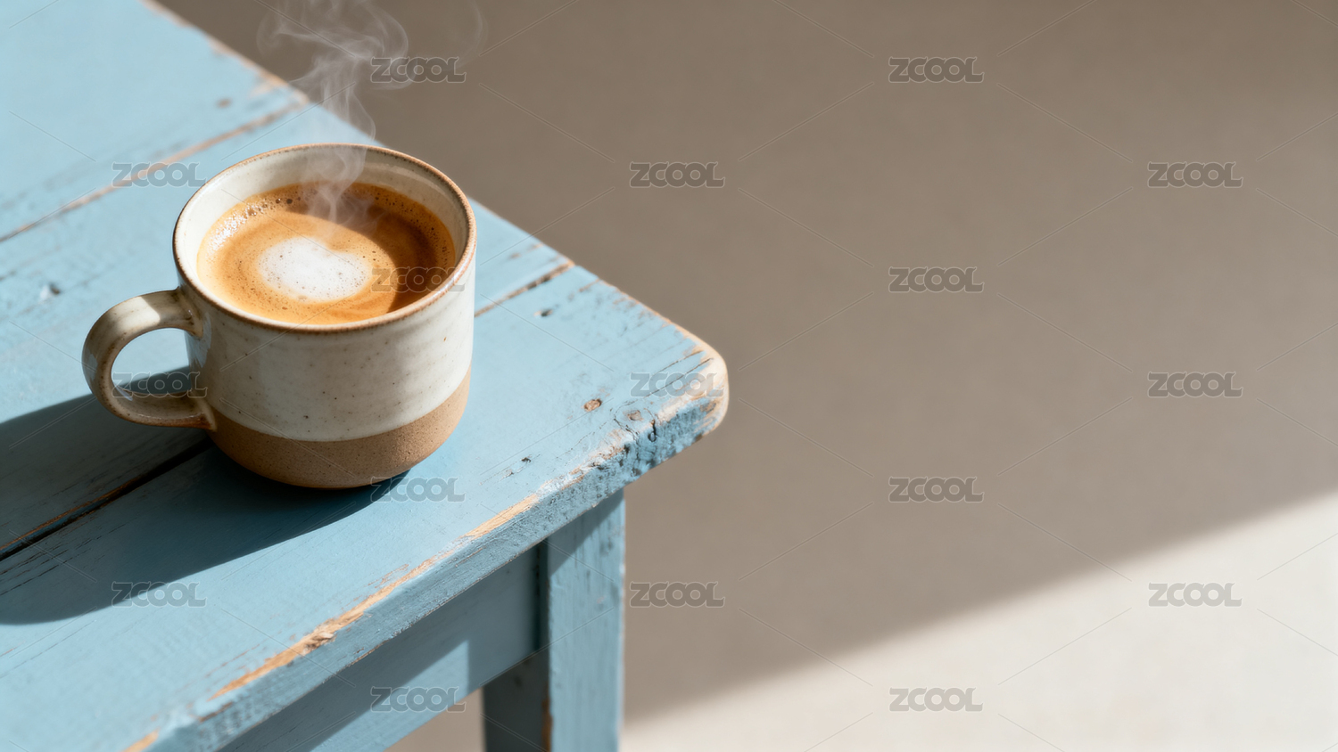 热咖啡杯置于蓝色木桌一角