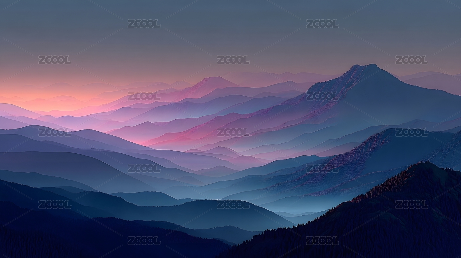 山峦,雾霭,暮色,霞光,层叠,云海,宁静,黄昏,远山,朦胧