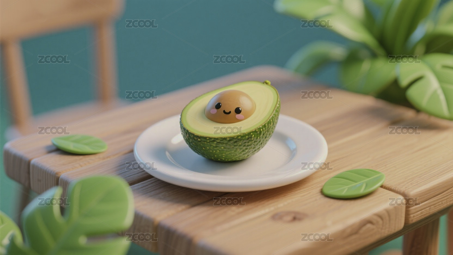 牛油果,卡通,可爱,笑脸,盘子,绿植,清新,治愈系,小场景,萌物