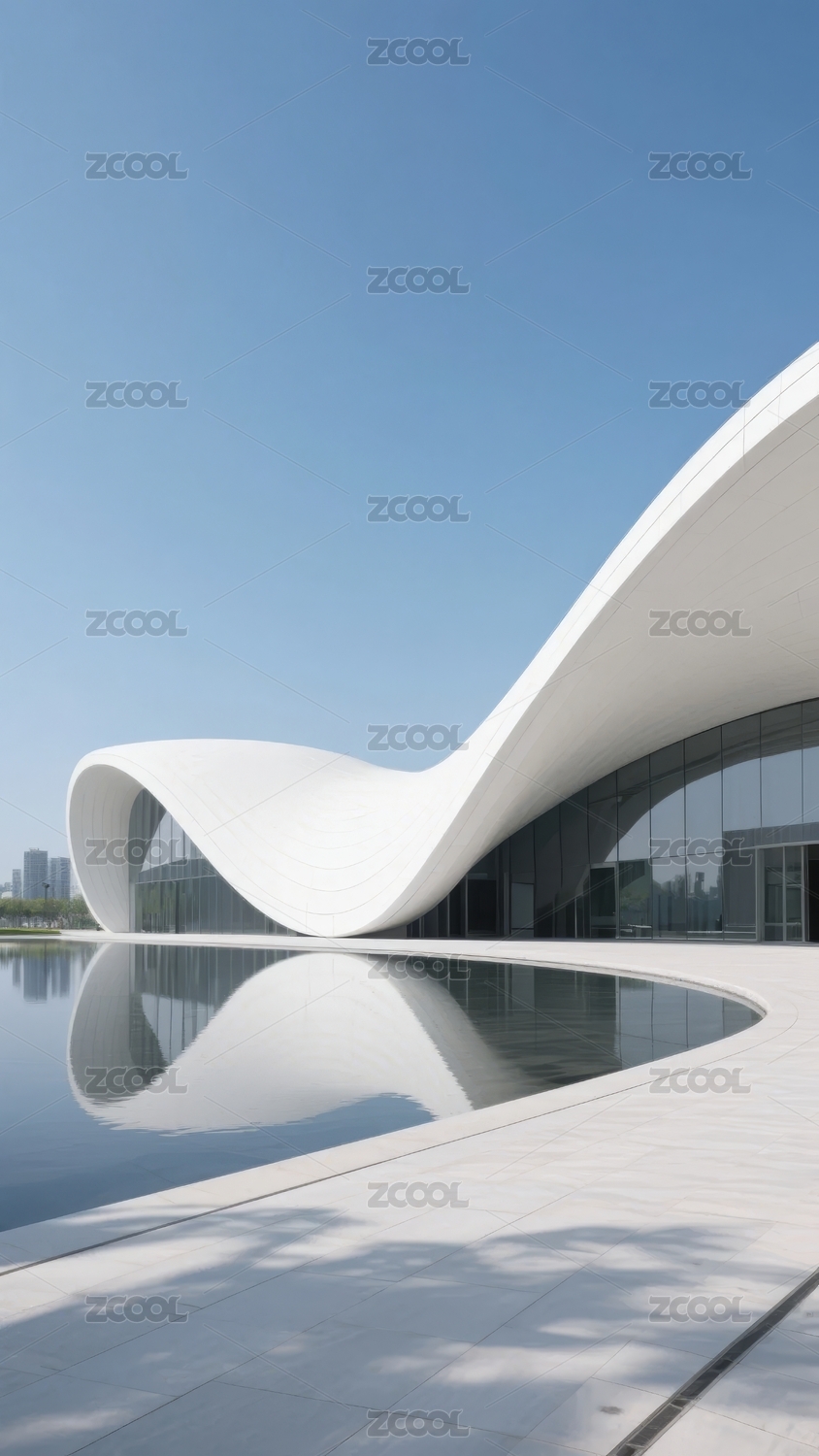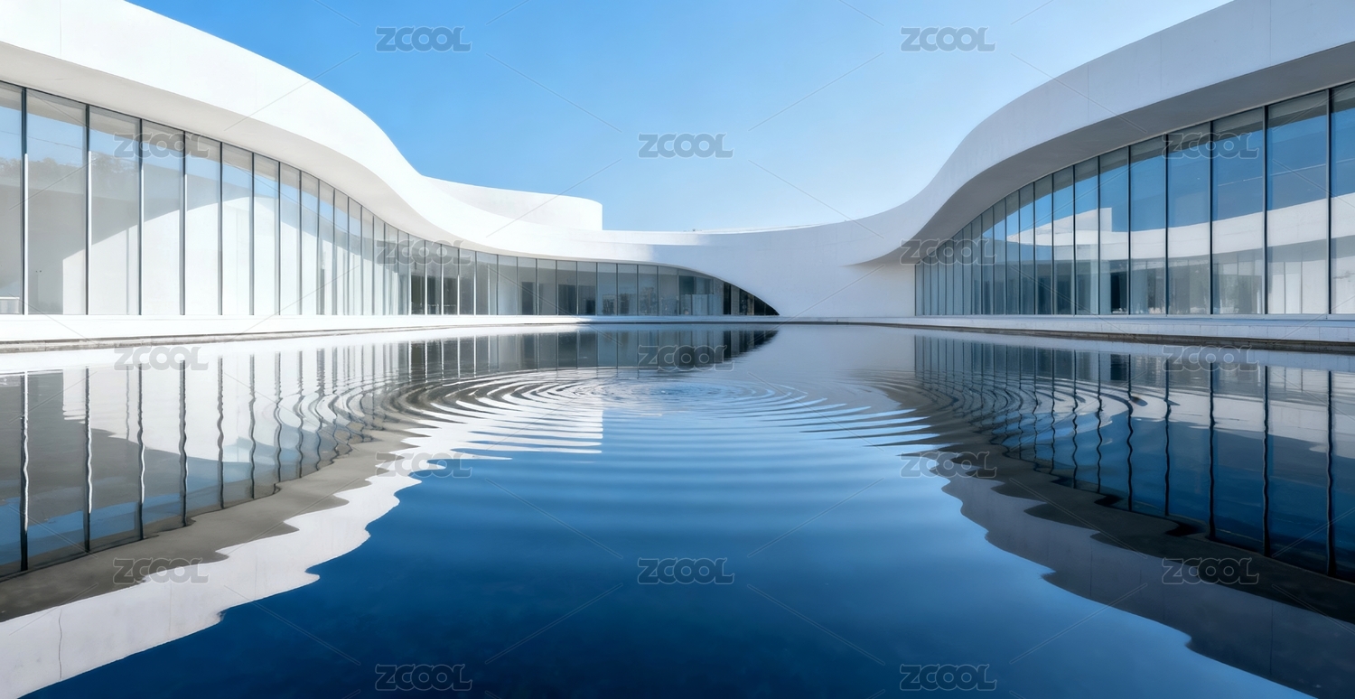 白色流线建筑与水面倒影