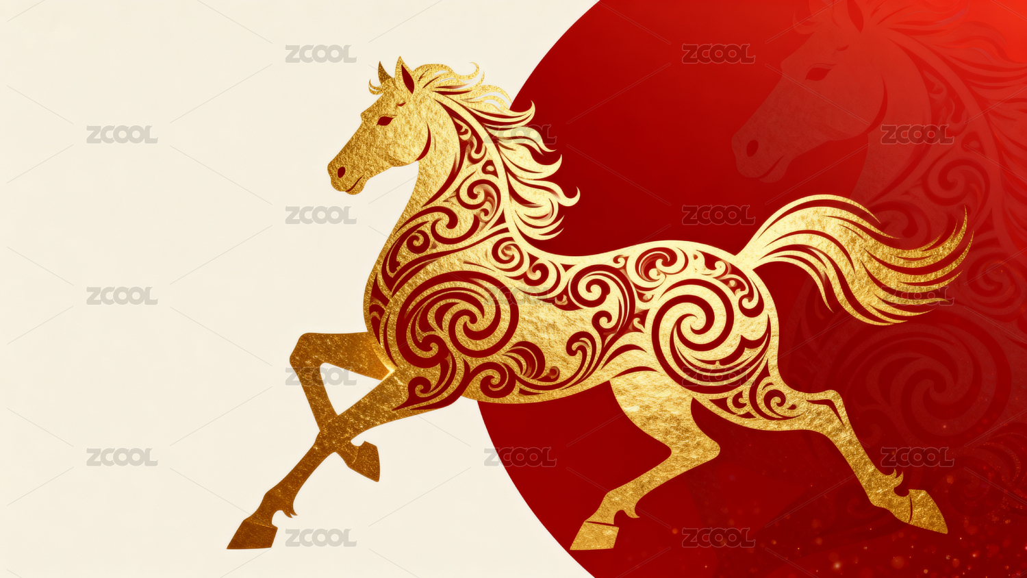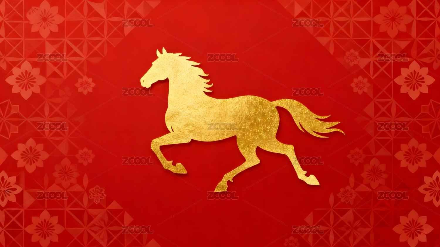 金色骏马奔跑在红色花纹背景上