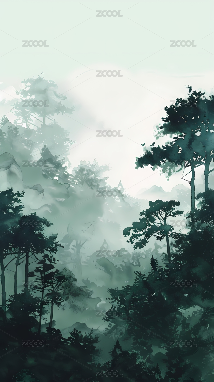 蓝绿色水墨树木抽象插画海报背景装饰画