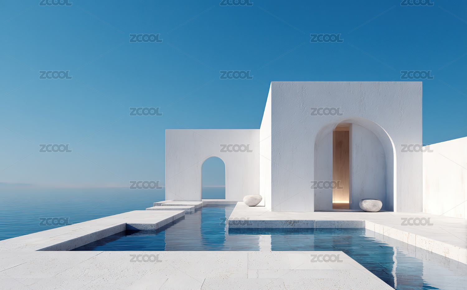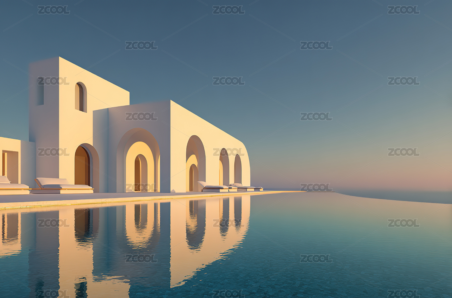 白色建筑与无边泳池海景
