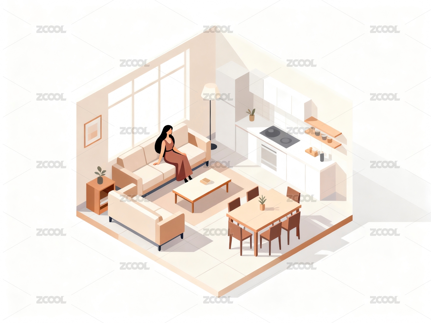 房间内的人沙发书柜植物