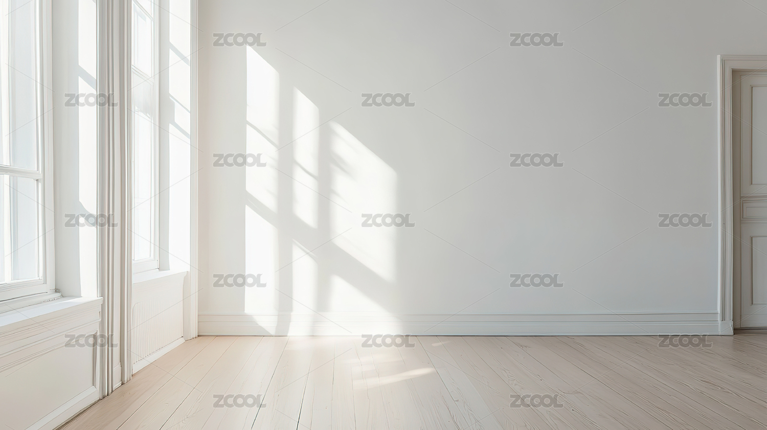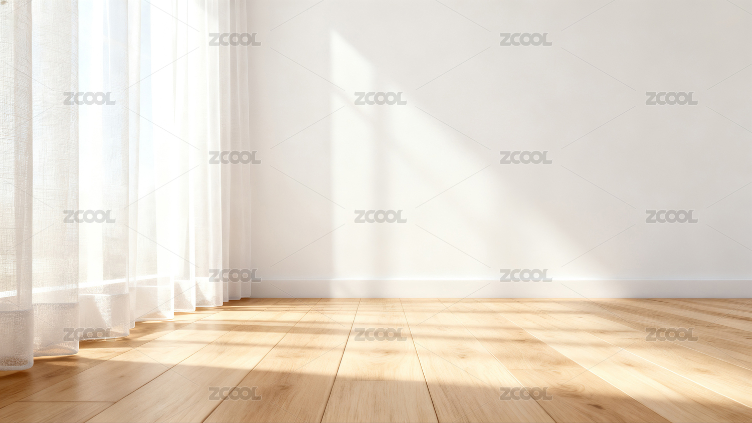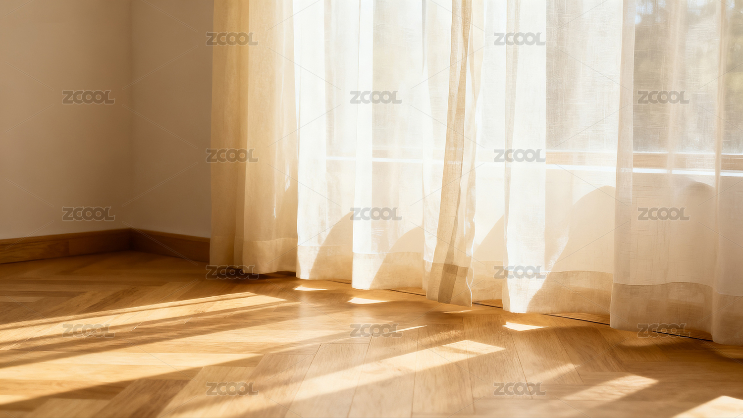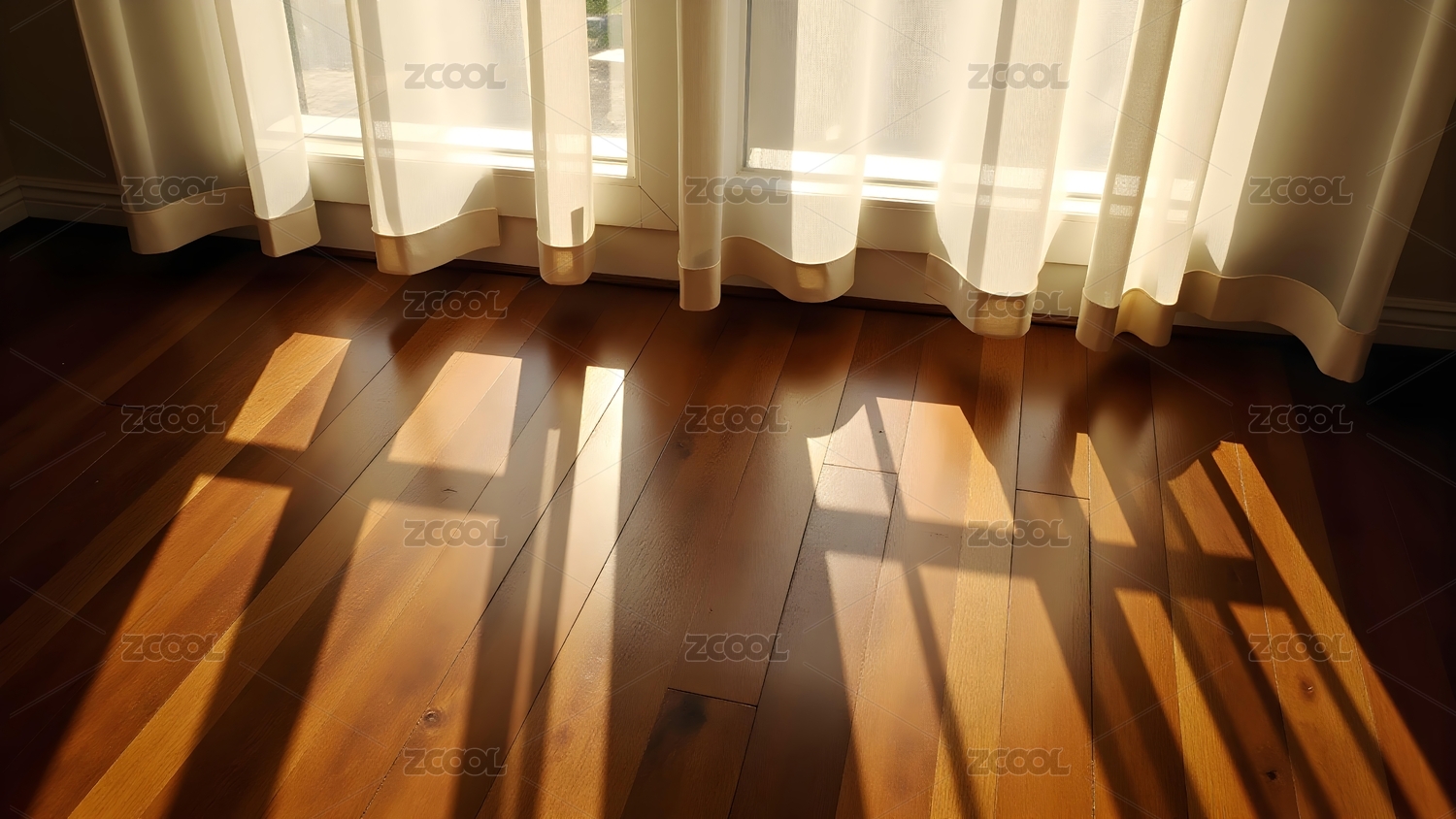 阳光透过窗户洒在木质地板上的空房间